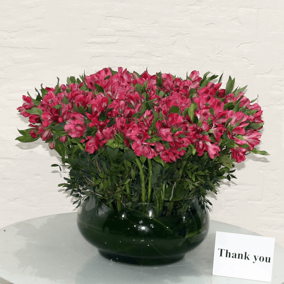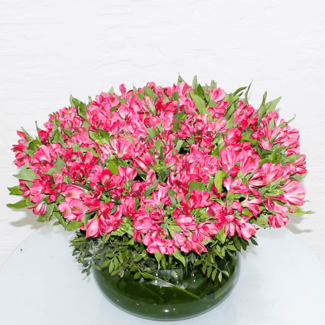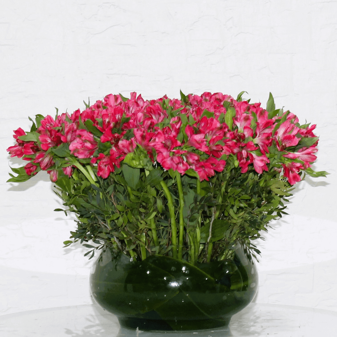 زهرة الالستروميريا الحمراء والخضراء الجميلة في مزهرية زجاجية