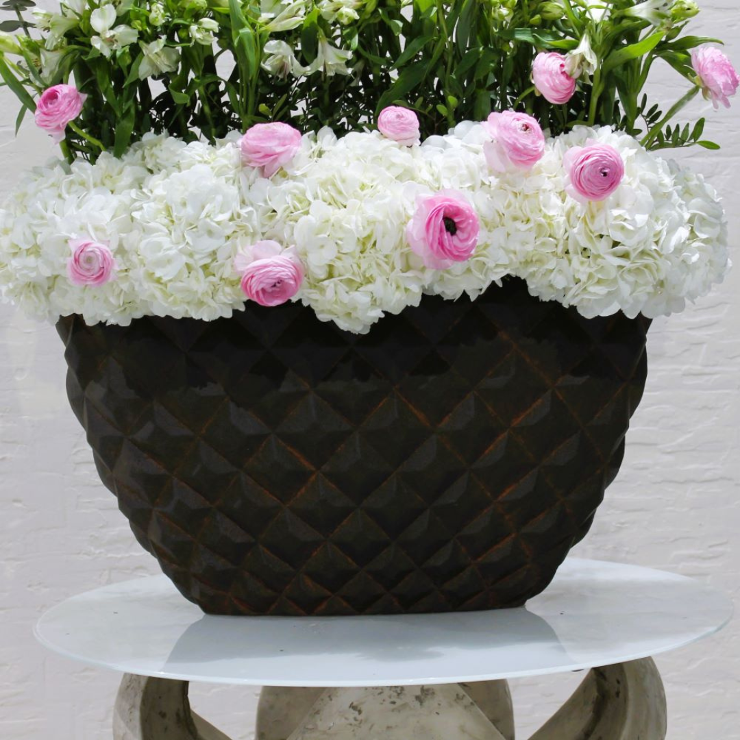 Beautiful brown ceramic vase filled with amazing white amarylis,hydrangeas ,alstromarias and pink rananculus flowers.