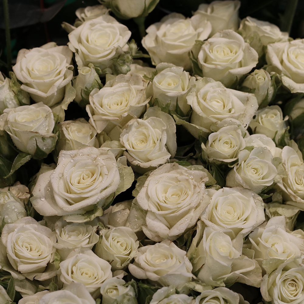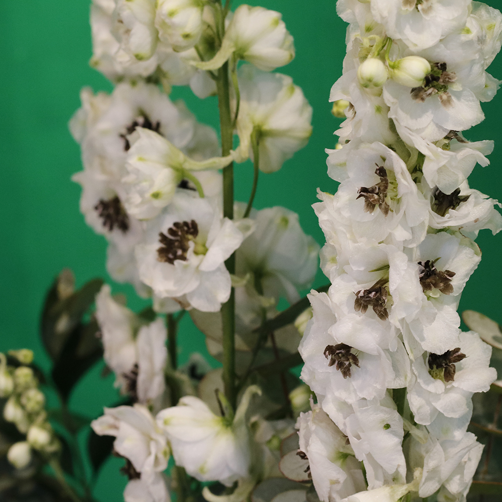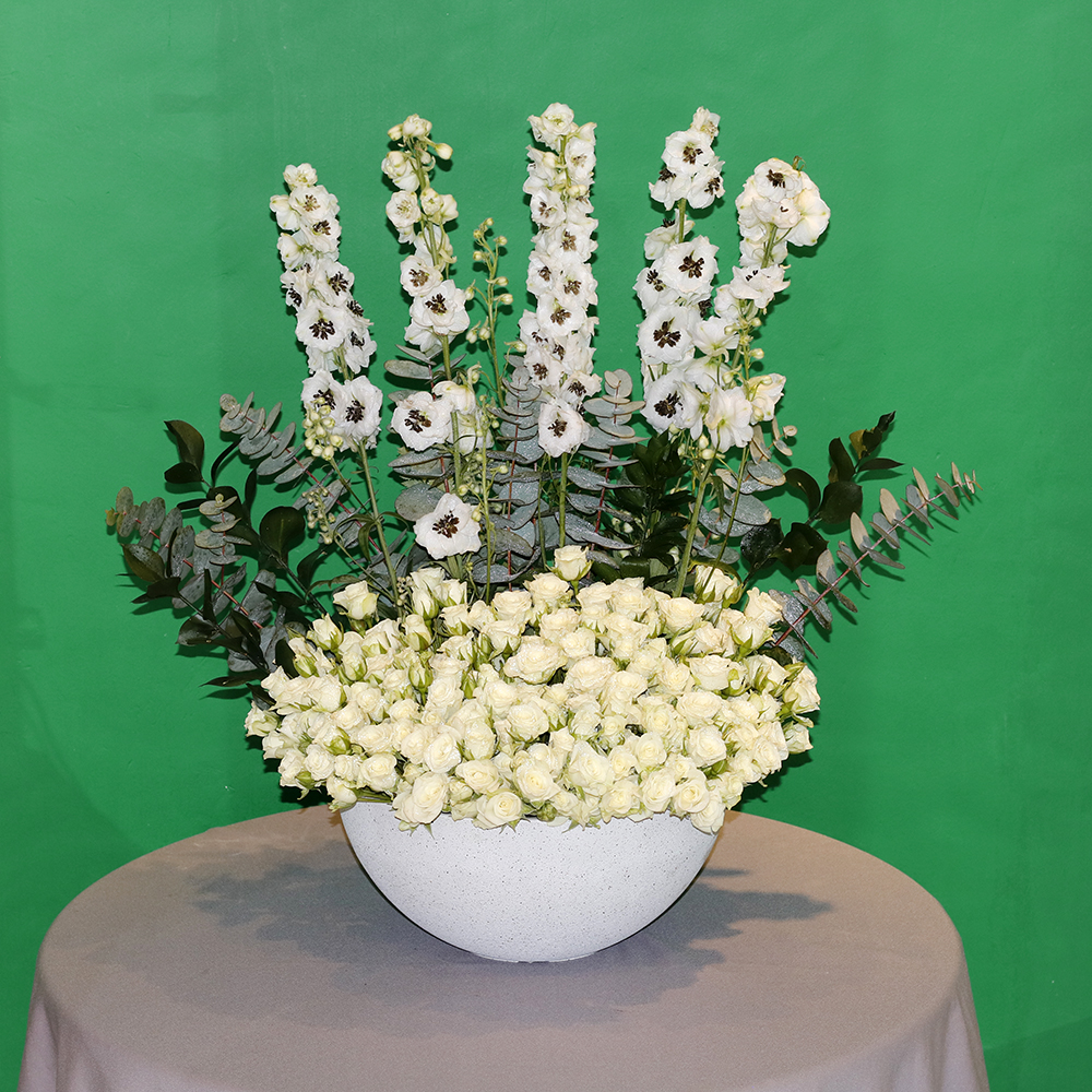 | Beautiful arrangement made with delphiniums, baby Rose in a white vases. |
