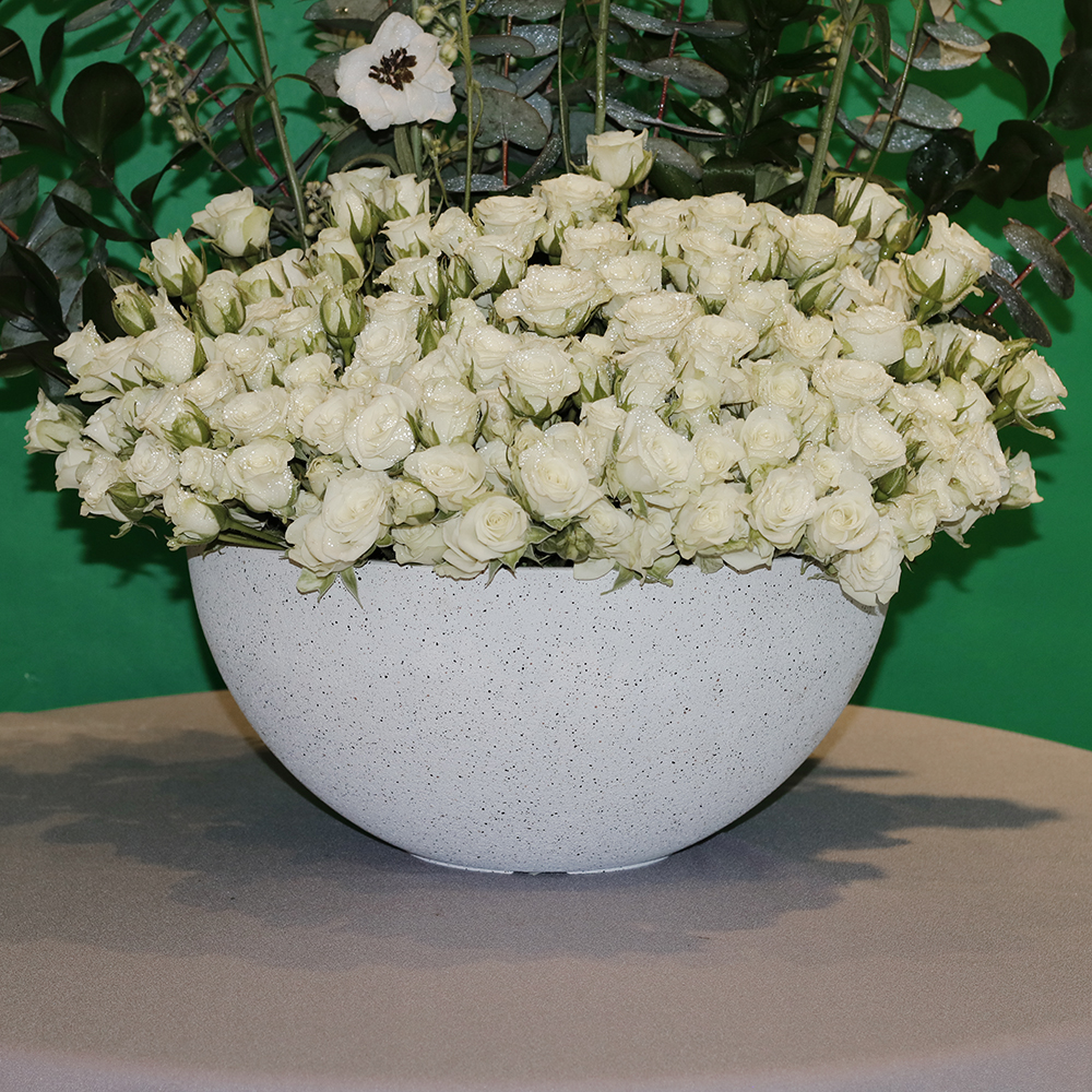 | ترتيب جميل مصنوع من الدلفينيوم والورد الصغير في مزهريات بيضاء. |