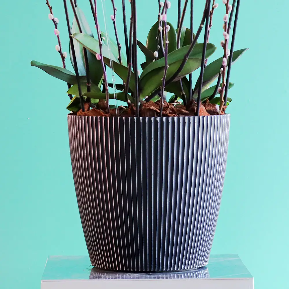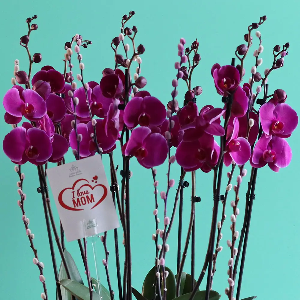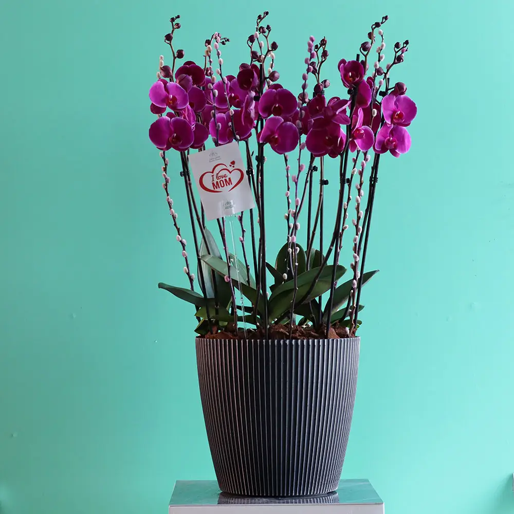 زهور الأوركيد الأرجوانية المذهلة مع زهور الألستروميريا في مزهرية فاخرة