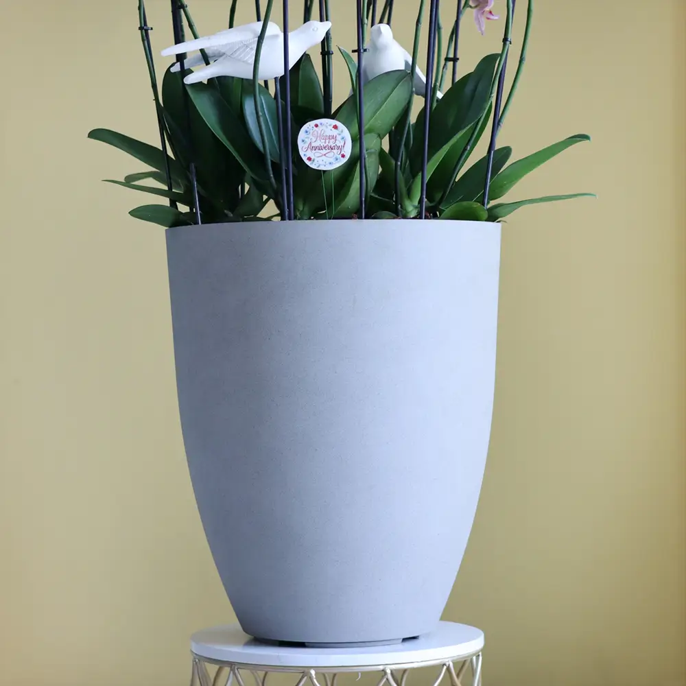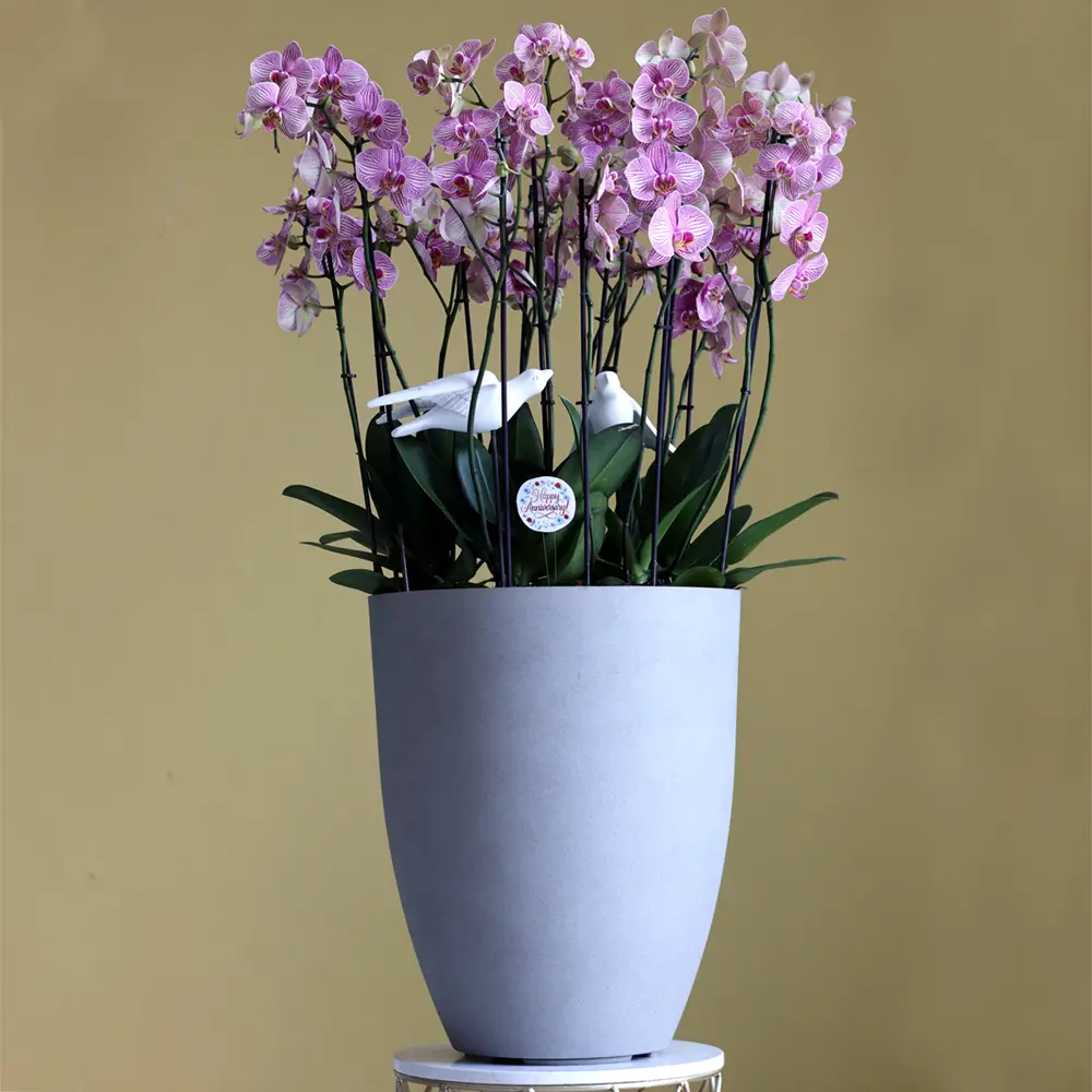 A bouquet containing pink orchid plants, arranged beautifully in a luxurious vase.