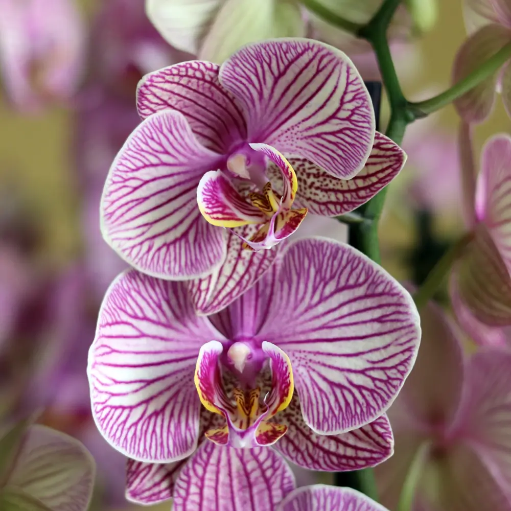 باقة تحتوي على نباتات الأوركيد الوردية، مرتبة بشكل جميل في فازة فاخرة.