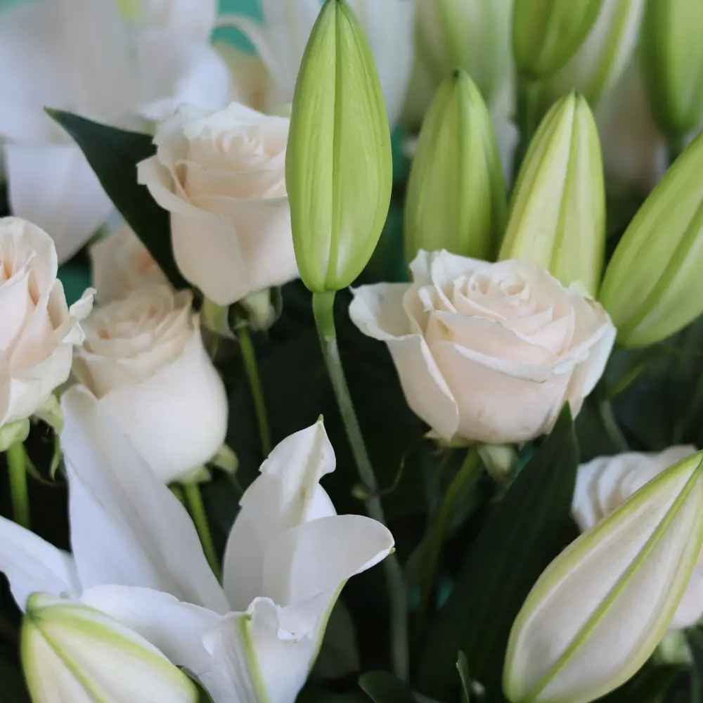 Beautiful white lilies and roses in a glass vase.