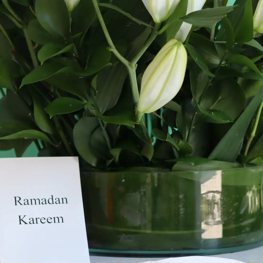 زهور ليلي وجوري بيضاء جميلة في فازة زجاجية.