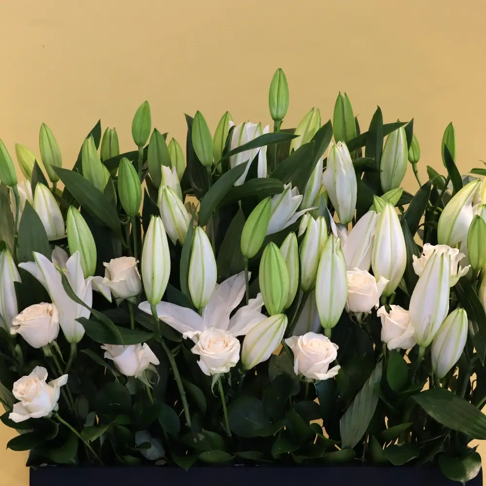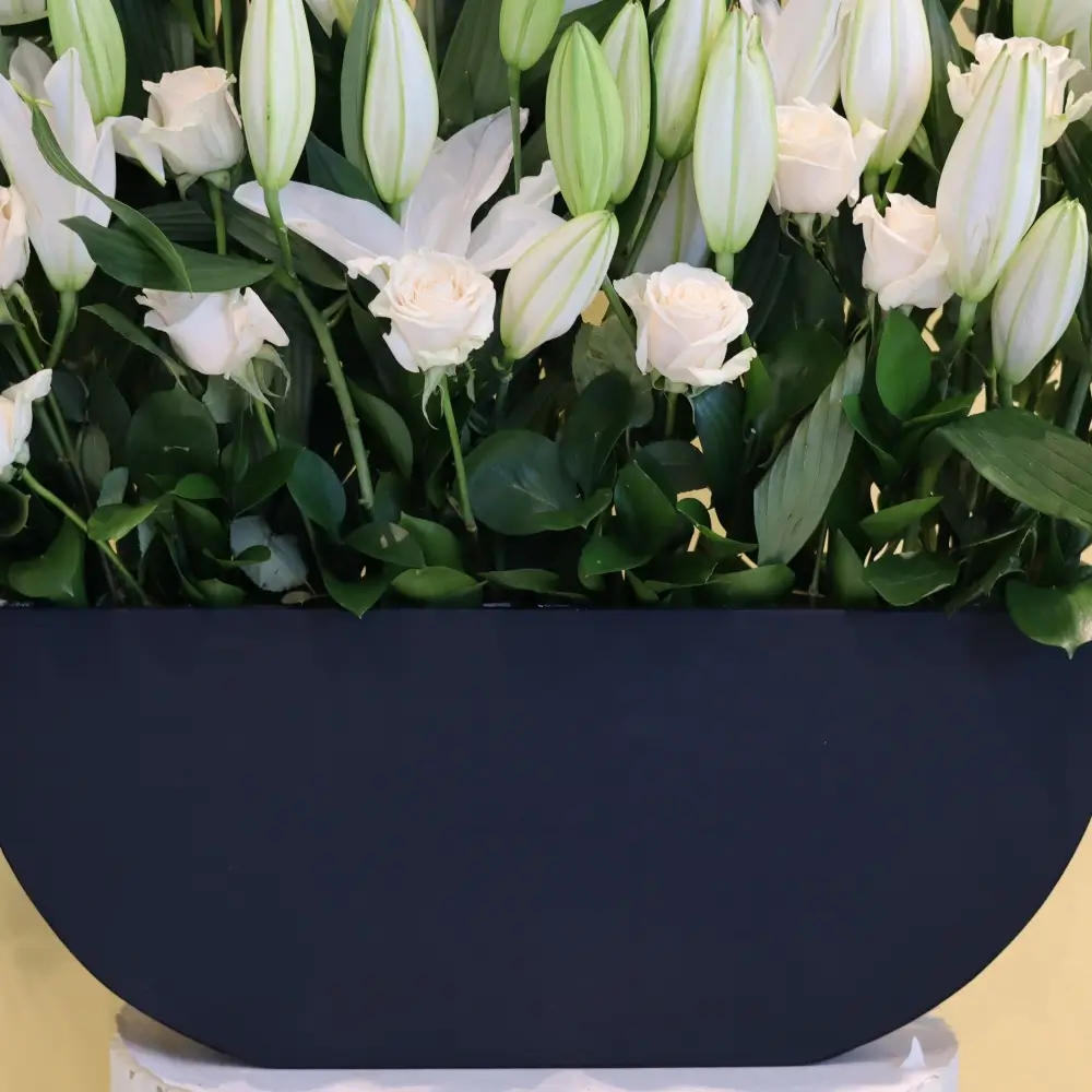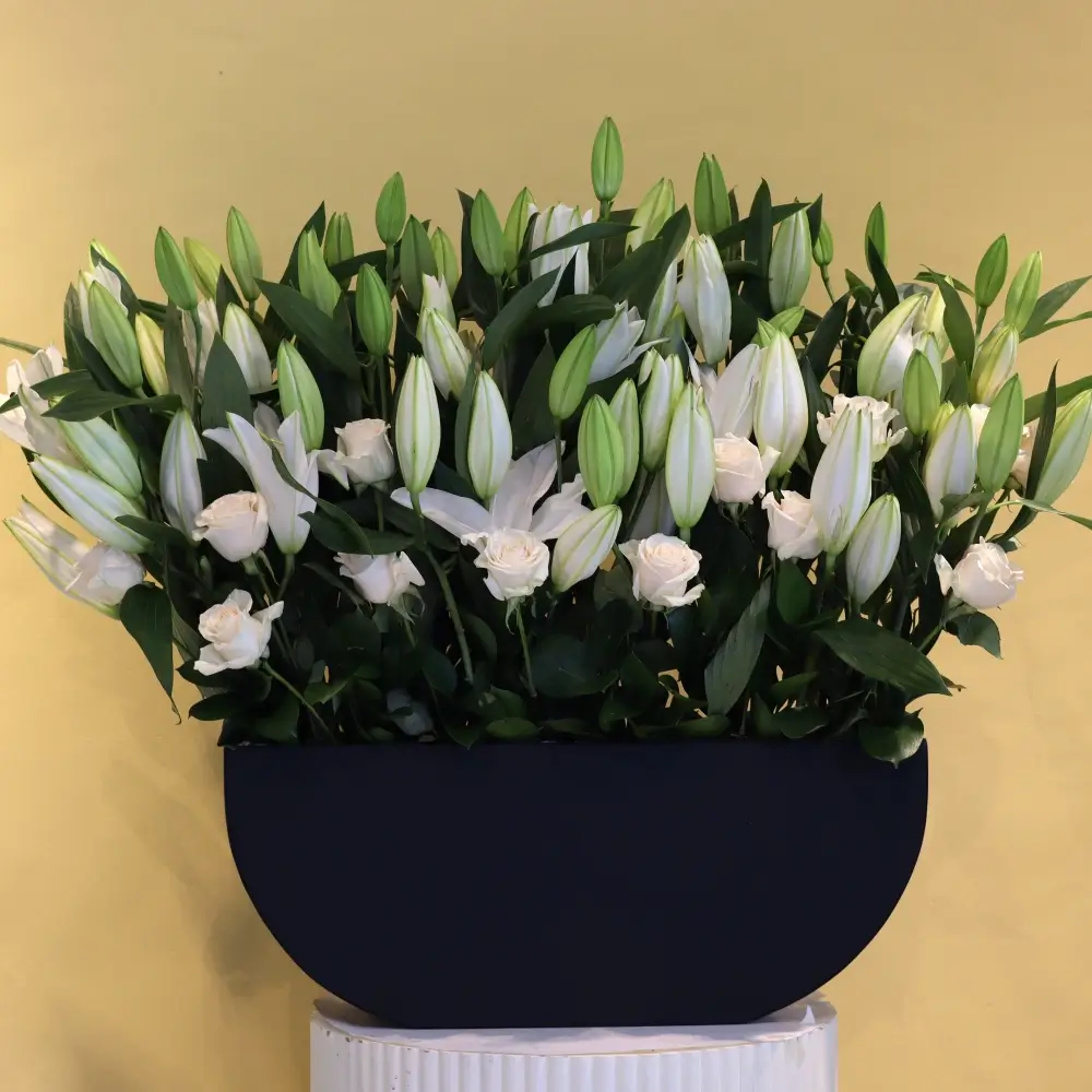 زنابق بيضاء جميلة وجوري في مزهرية سوداء.