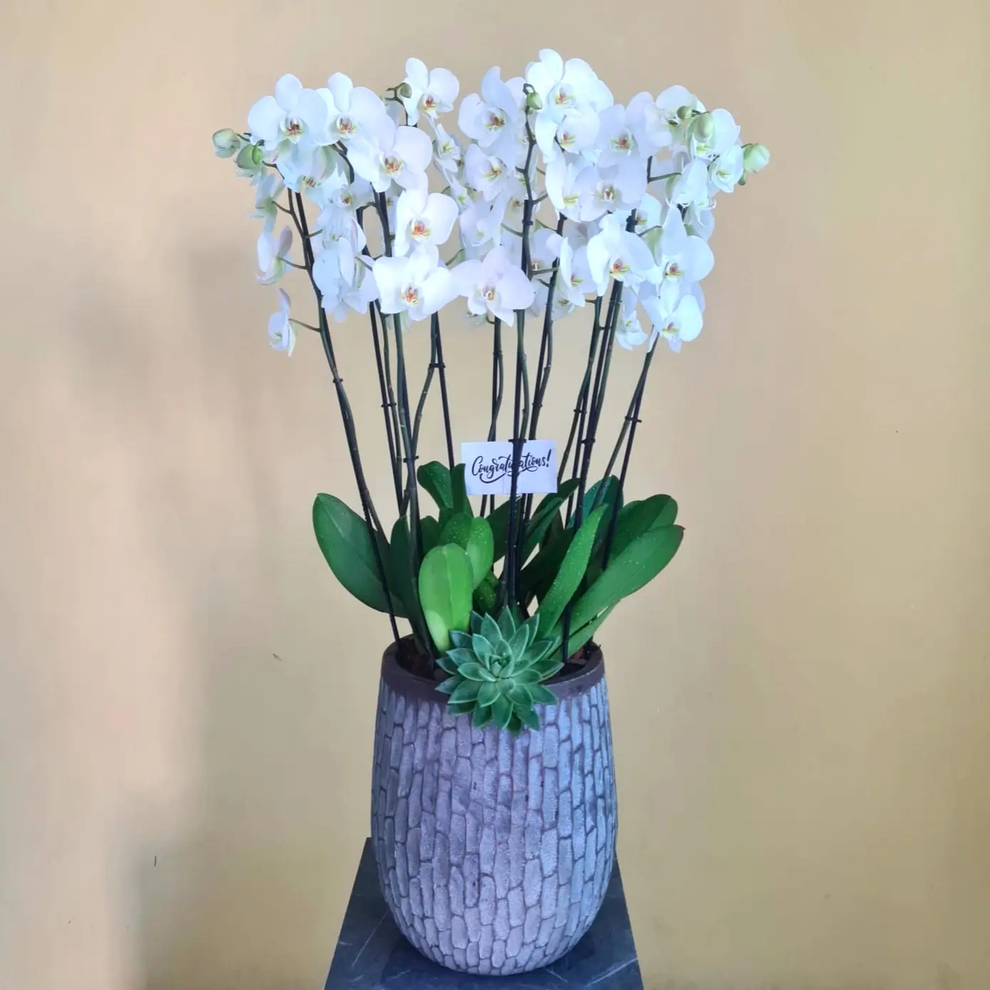 White Phalaenopsis with echeveria in brown luxurious vase.