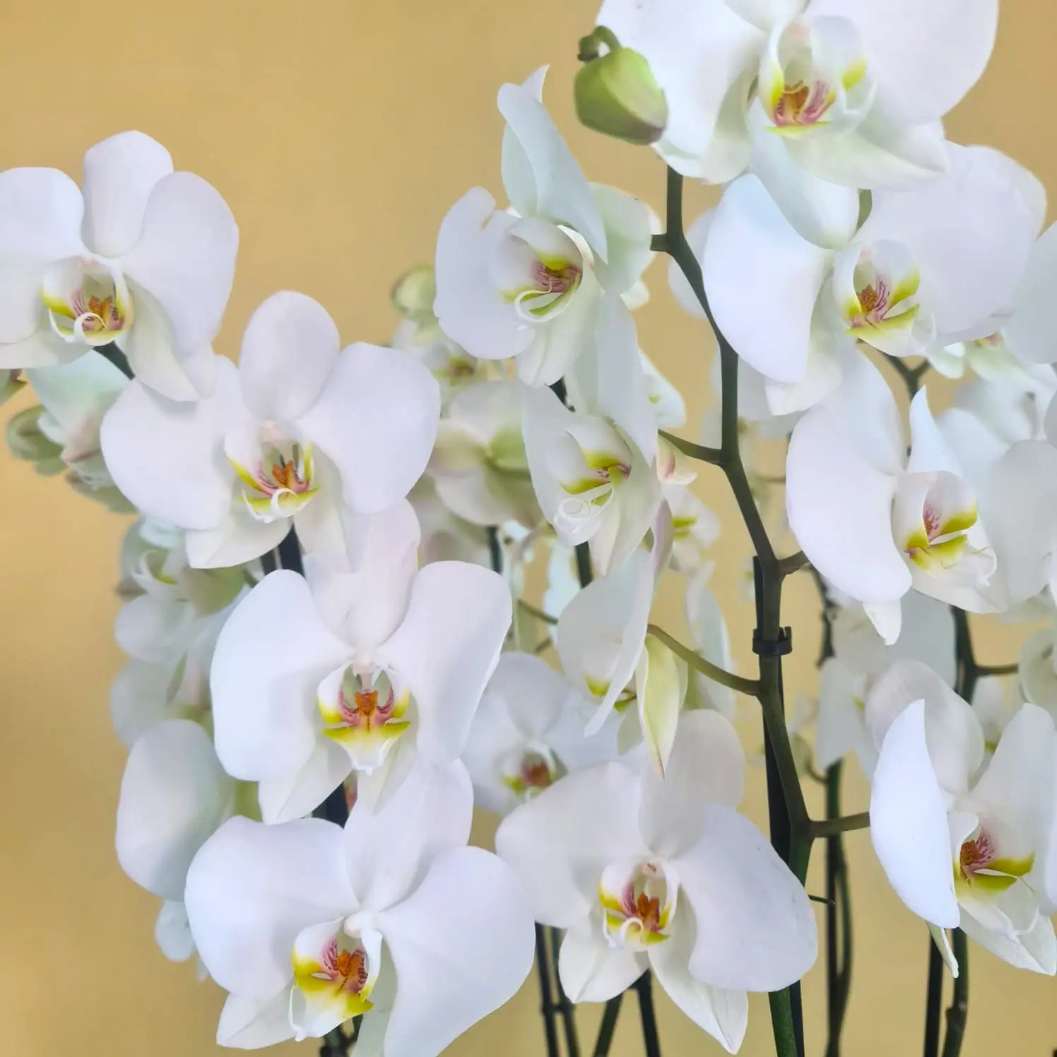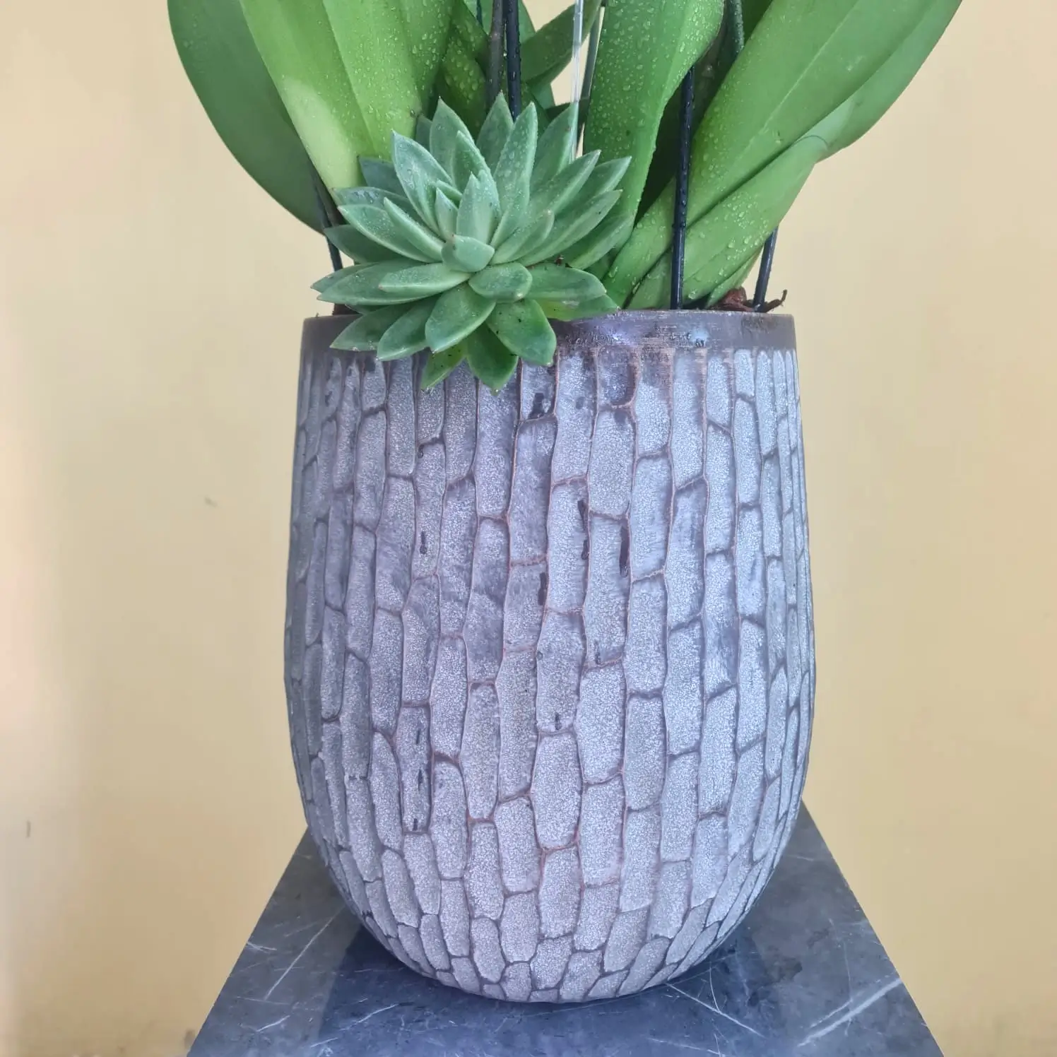 زهرة فالاينوبسيس بيضاء مع نبات إيشيفيريا في مزهرية بنية فاخرة.