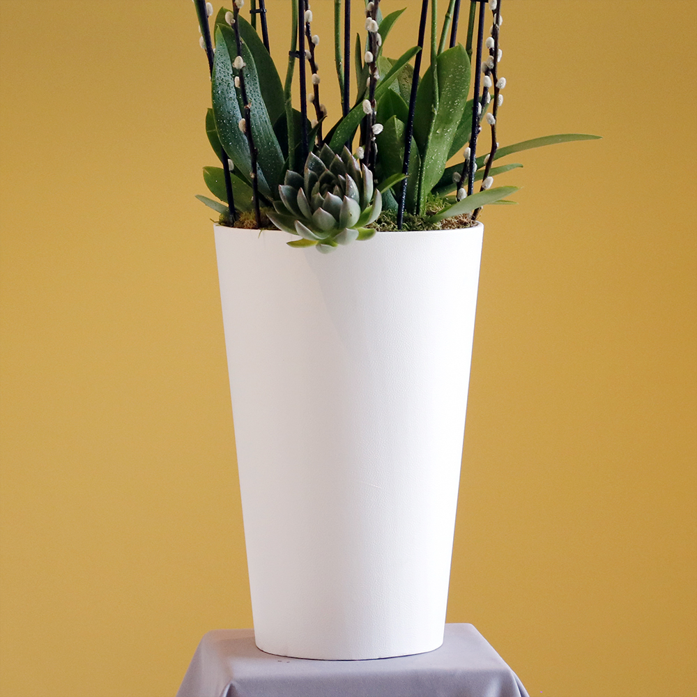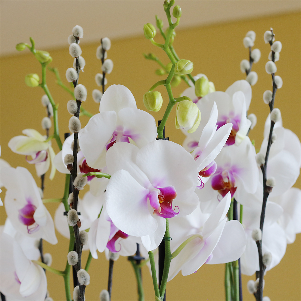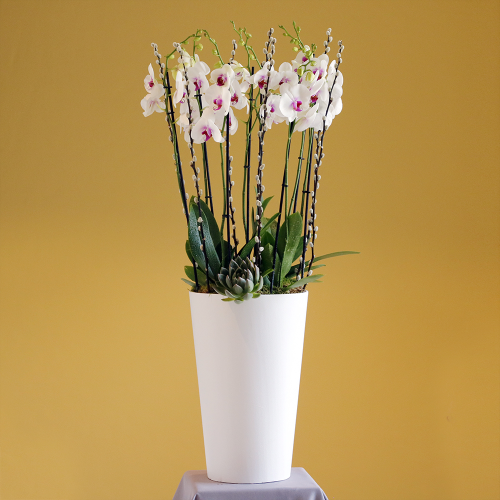 زهور الأوركيد ذات الشفاه الحمراء المذهلة في مزهريات فاخرة