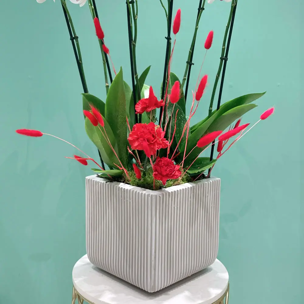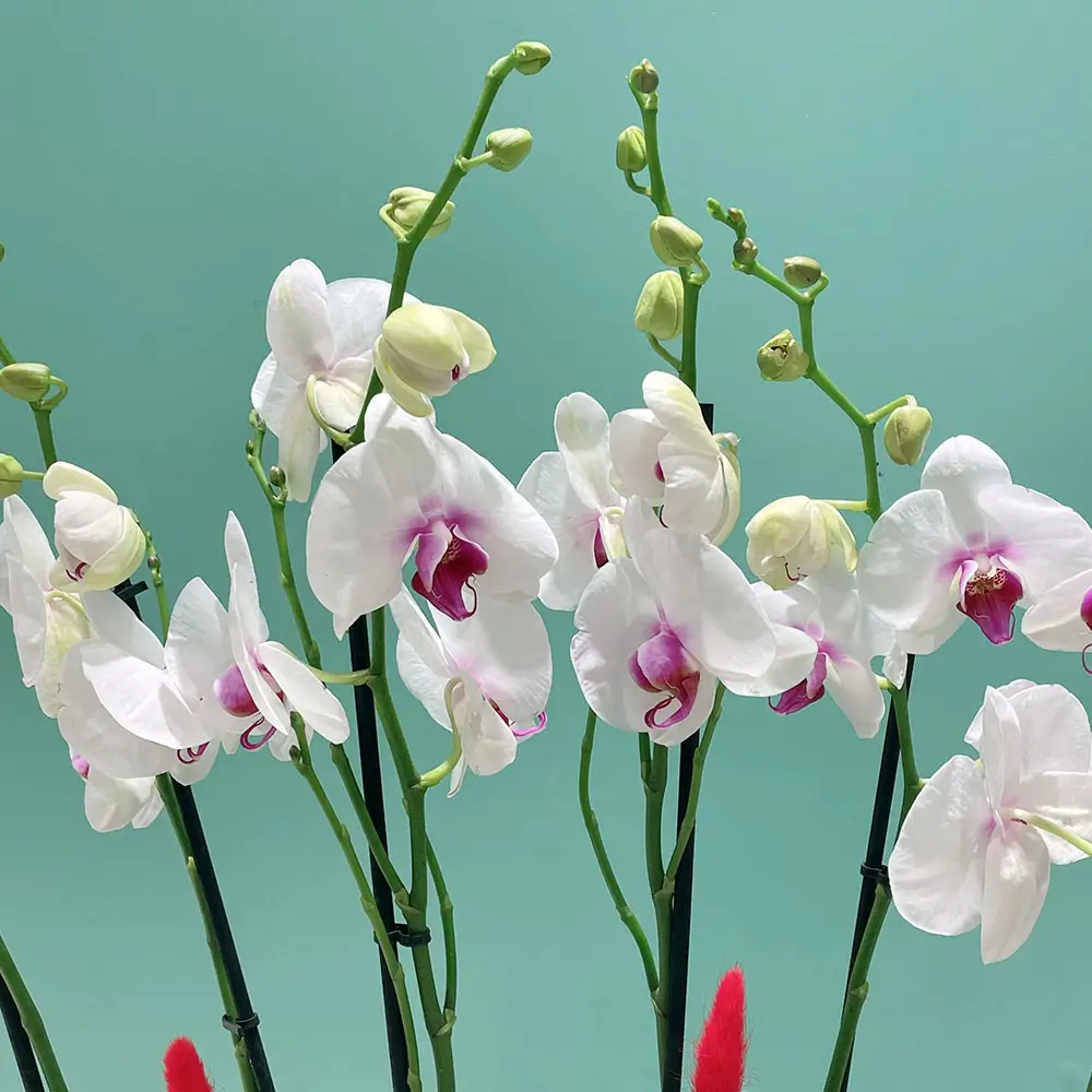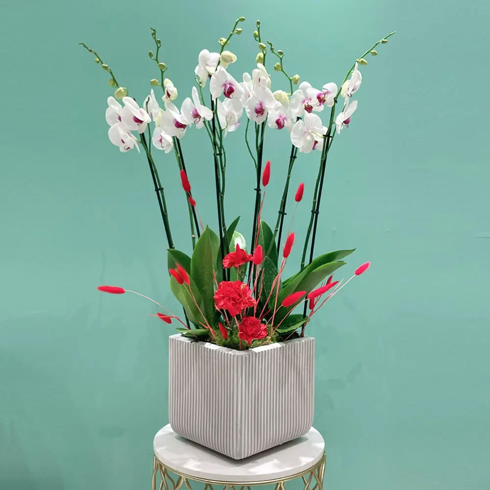زهور الأوركيد ذات الشفاه الحمراء المذهلة في مزهريات فاخرة
