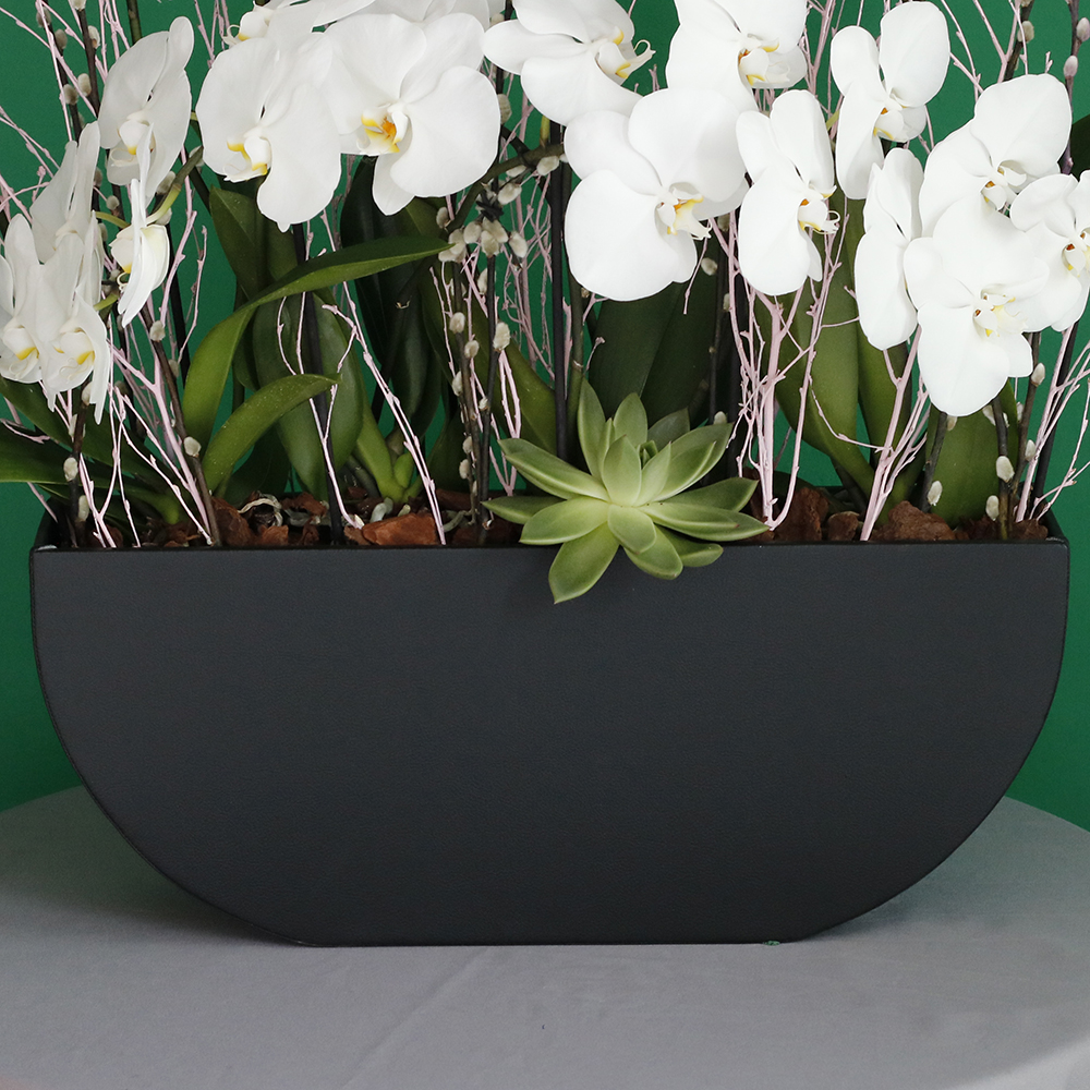 | زهور الأوركيد الخفيفة باللونين الوردي والأبيض في مزهريات فاخرة |
