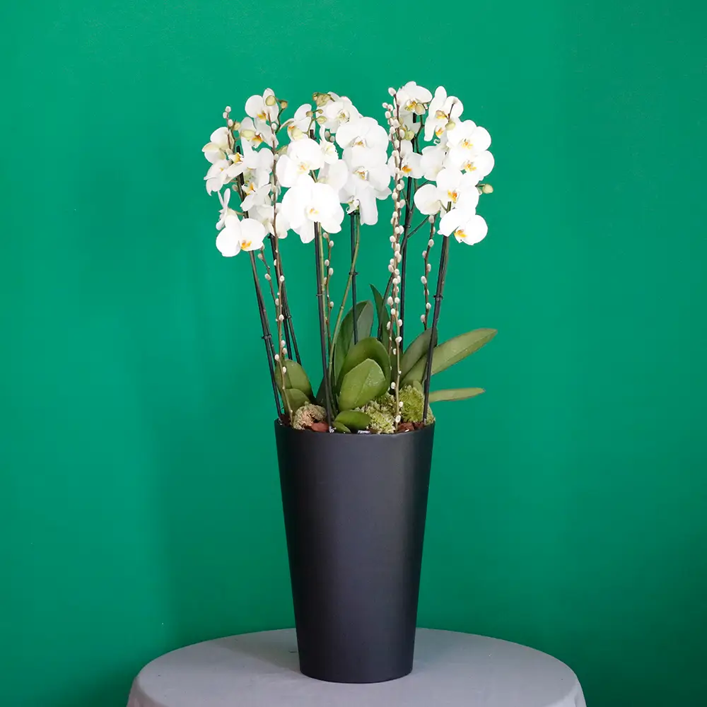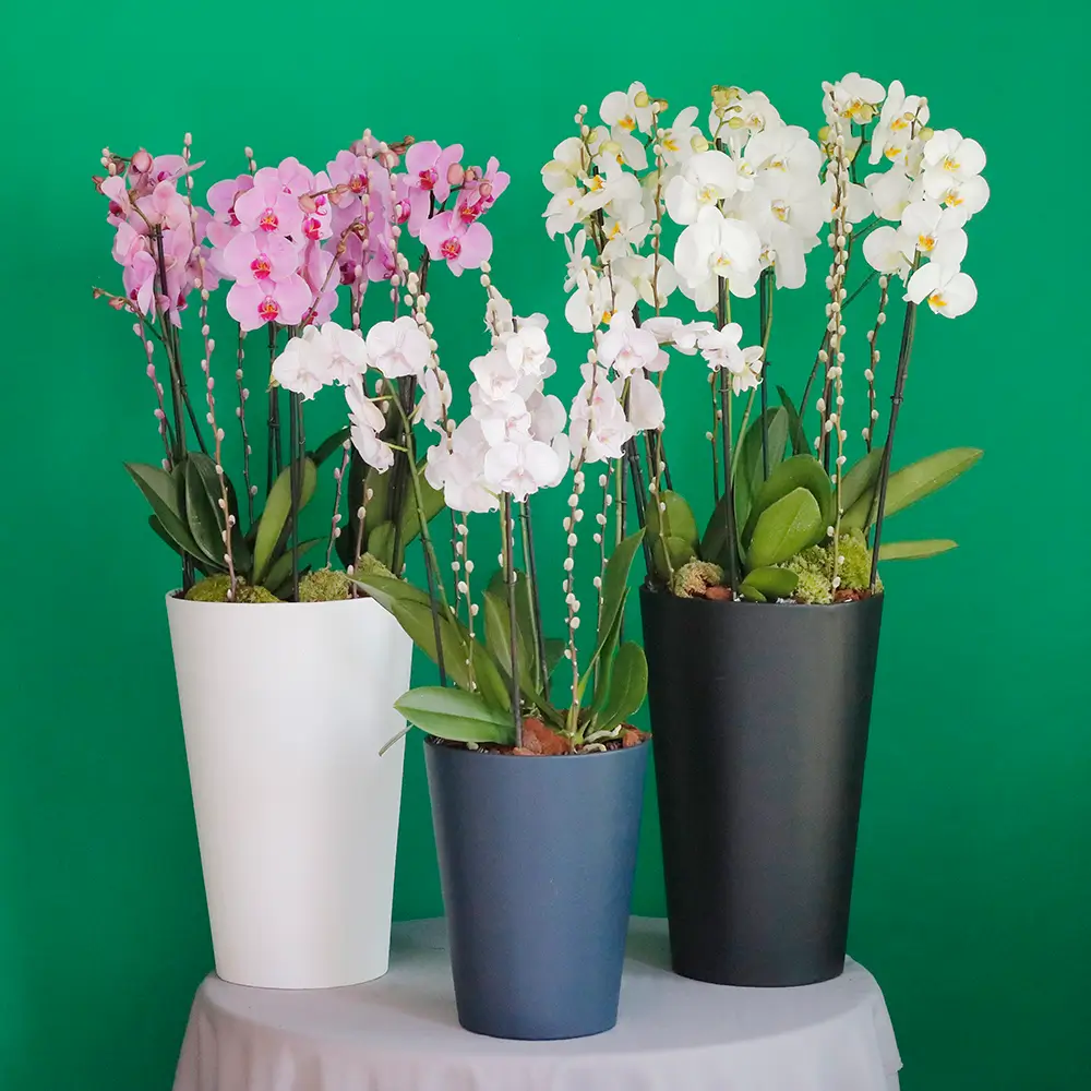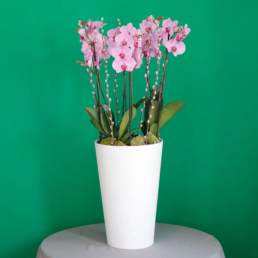أوركيد وردي أبيض ووردي فاتح في مزهرية فاخرة