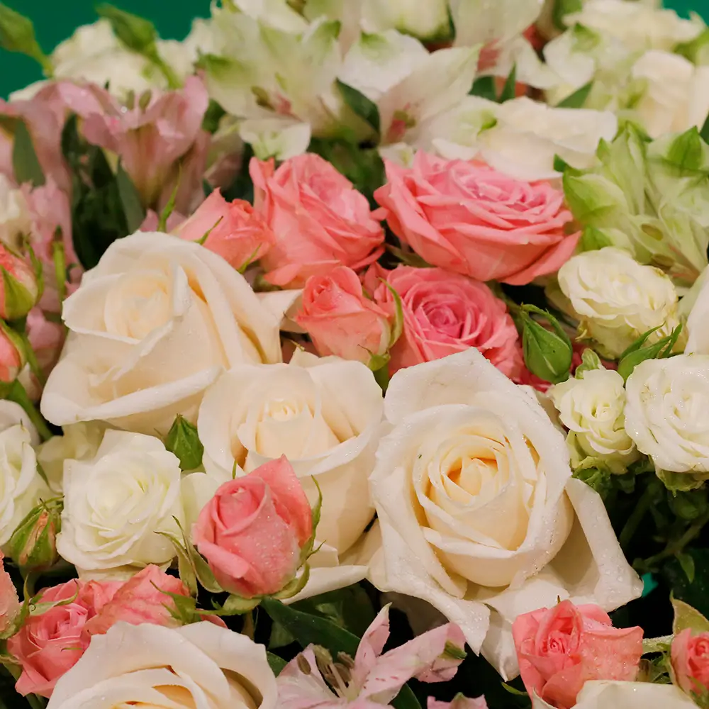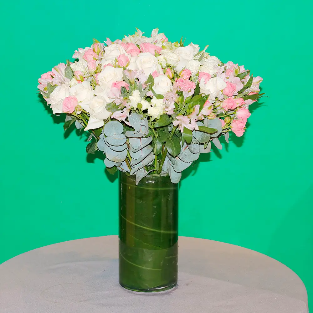 Beautiful Round Roses Alstroemeria and baby Roses in a Glass Vase