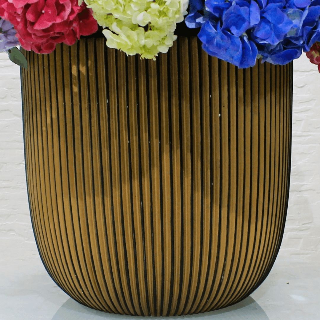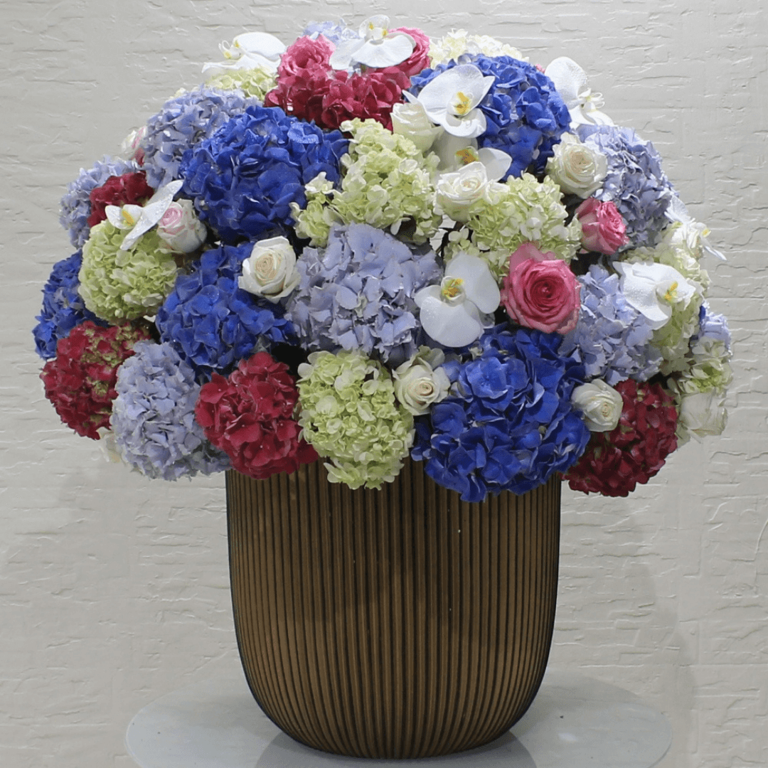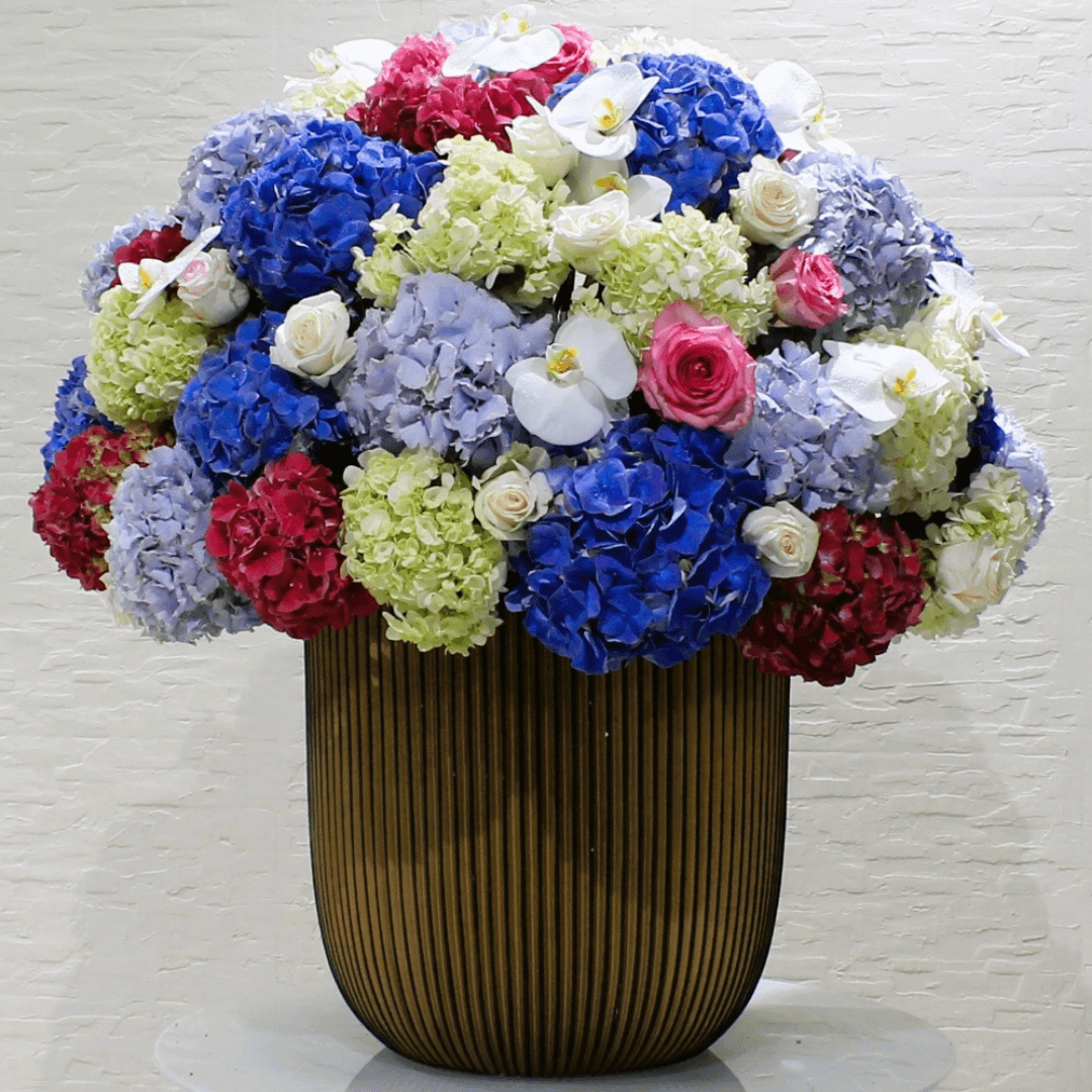 Beautiful hydrangeas,roses in a gold black ceramic vase.