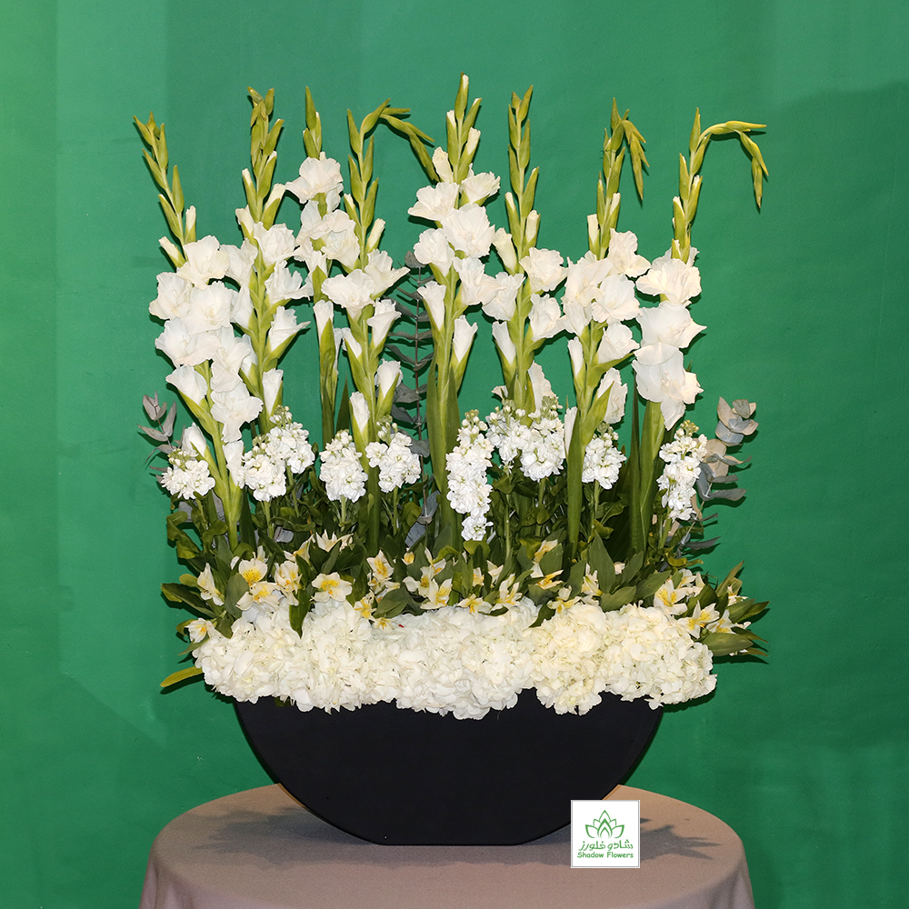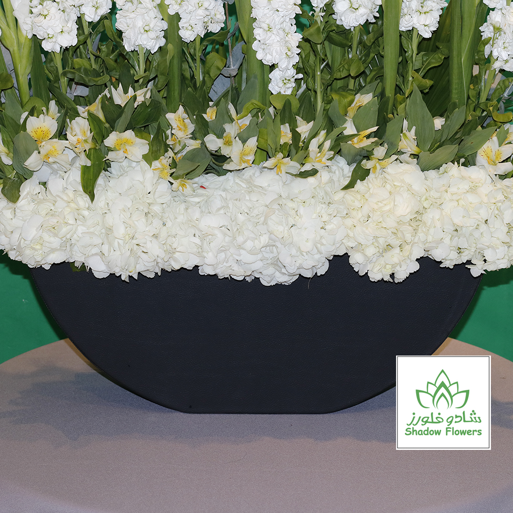 | Beautiful arranged in a gladiolus, mathiola, hydrangeas, alstroemeria with a luxury black oval. |