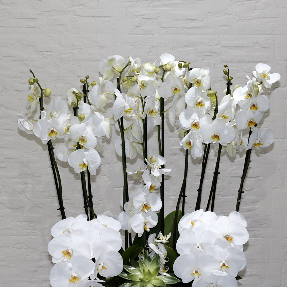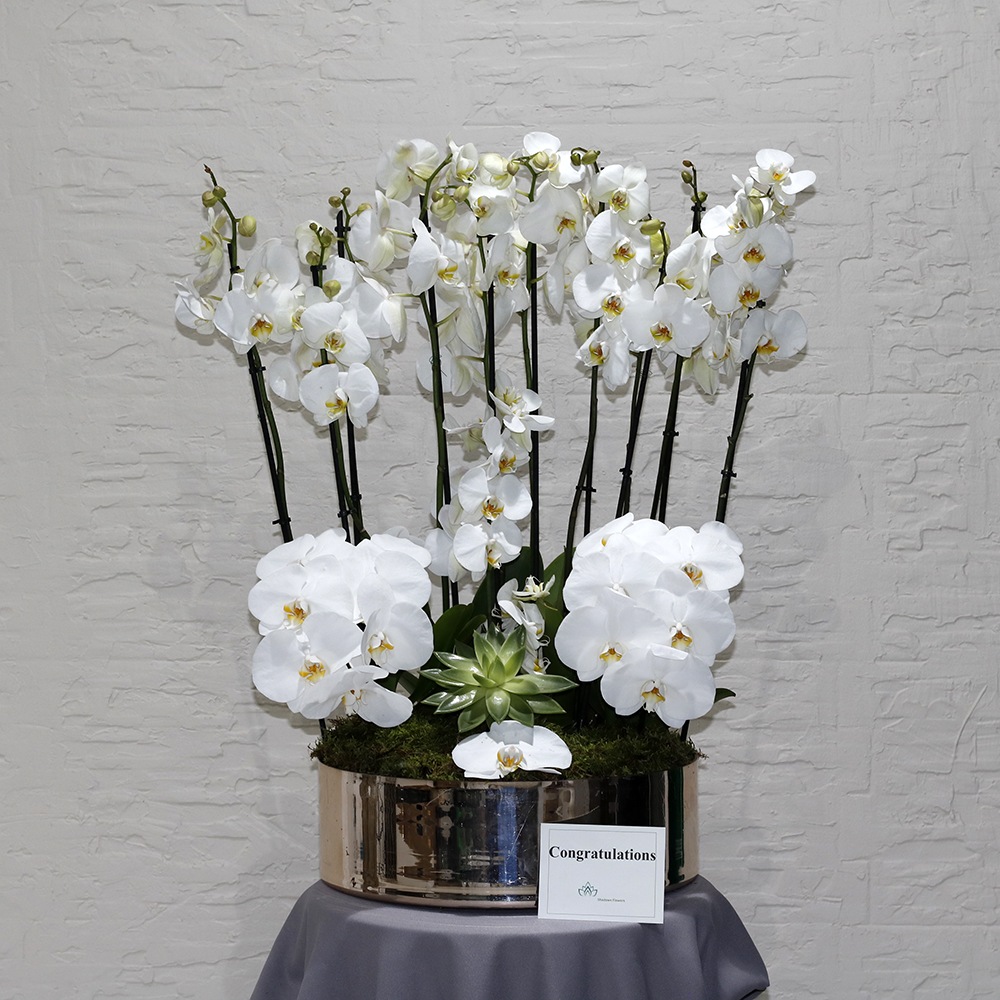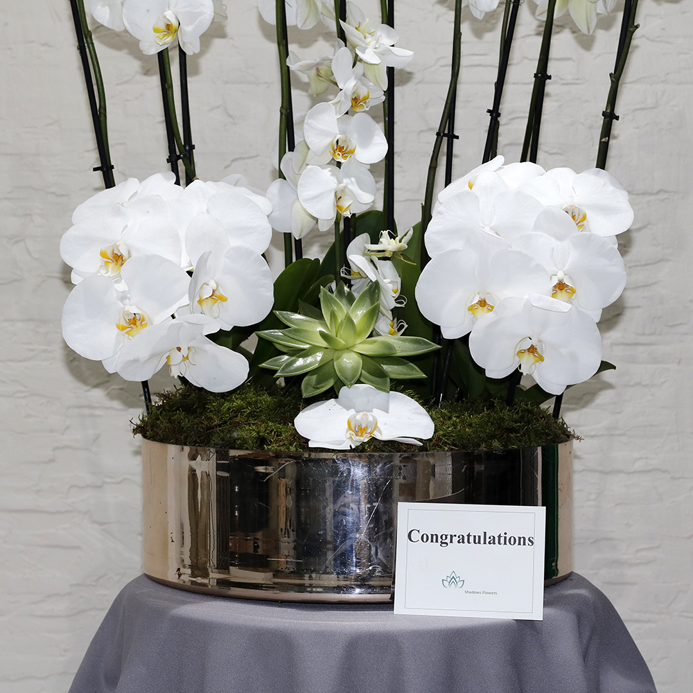 نباتات أوركيد بيضاء في فازة دائرية ذهبية.