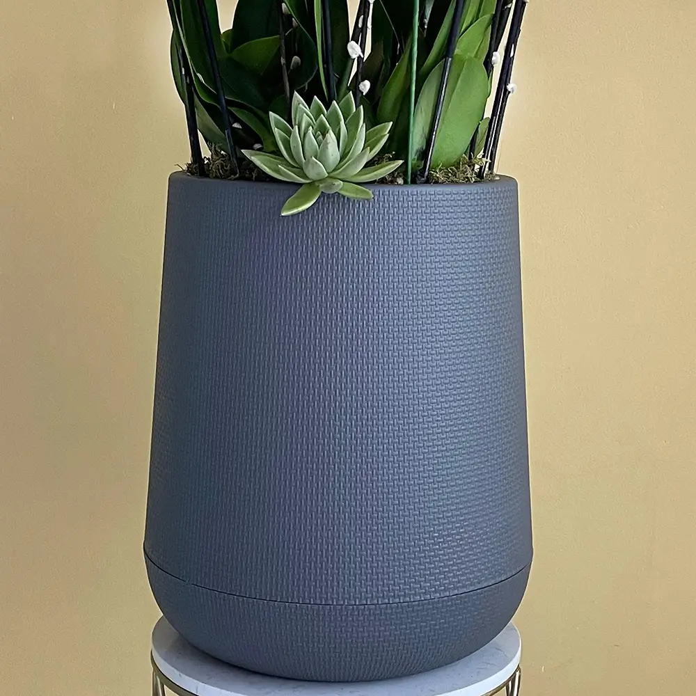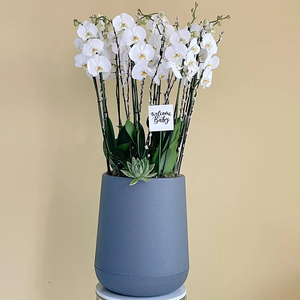 A beautiful arrangement of white orchid plants in a luxurious vase.
