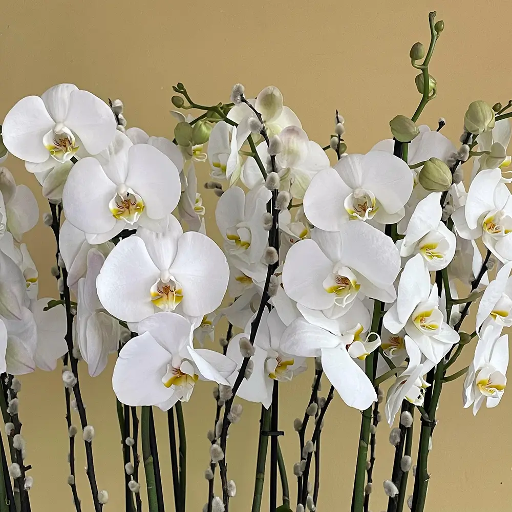 ترتيب جميل من نباتات الأوركيد البيضاء في فازة فاخرة.