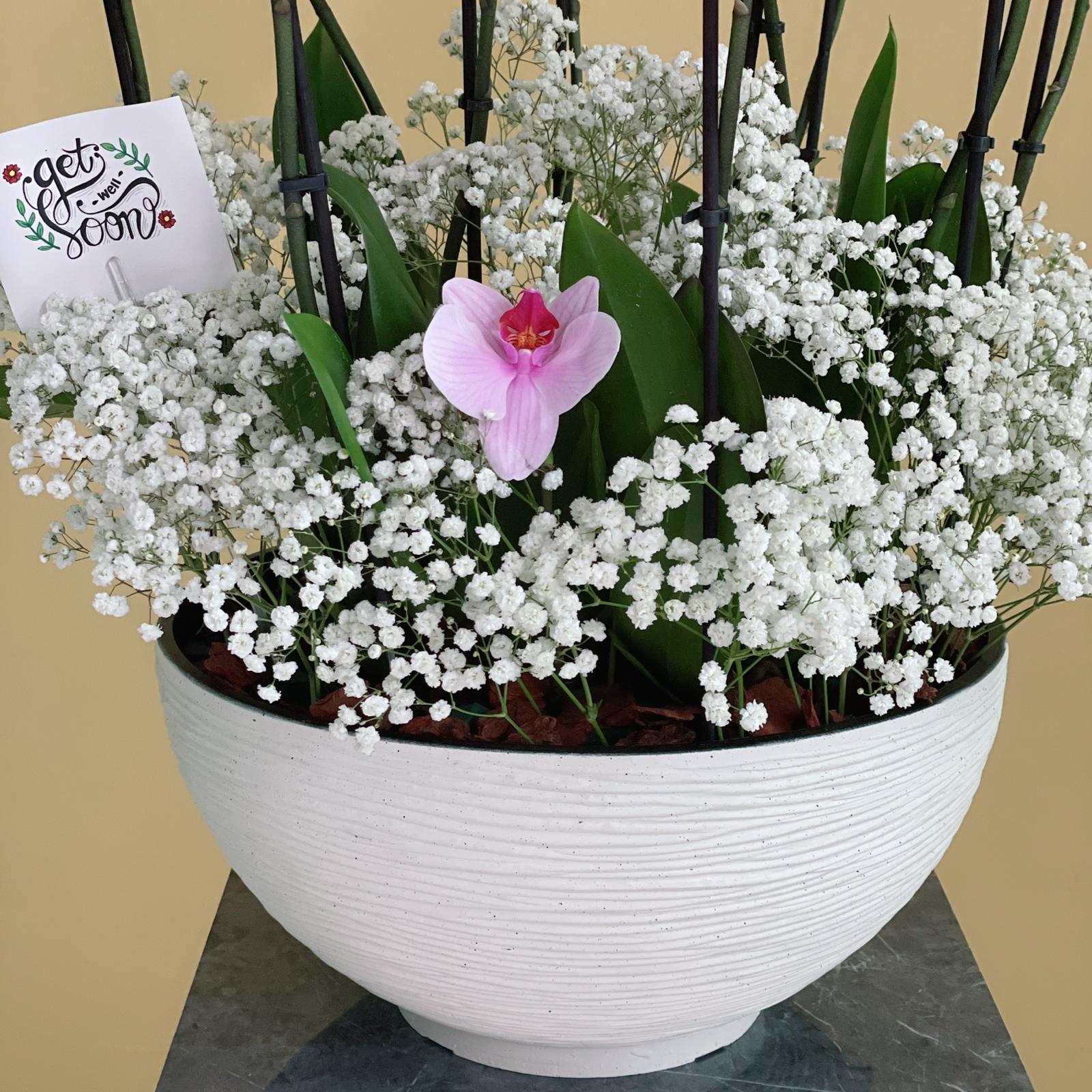 نباتات مانتا أمبون فالاينوبسيس مع الجبسوفيلا في مزهرية بيضاء.