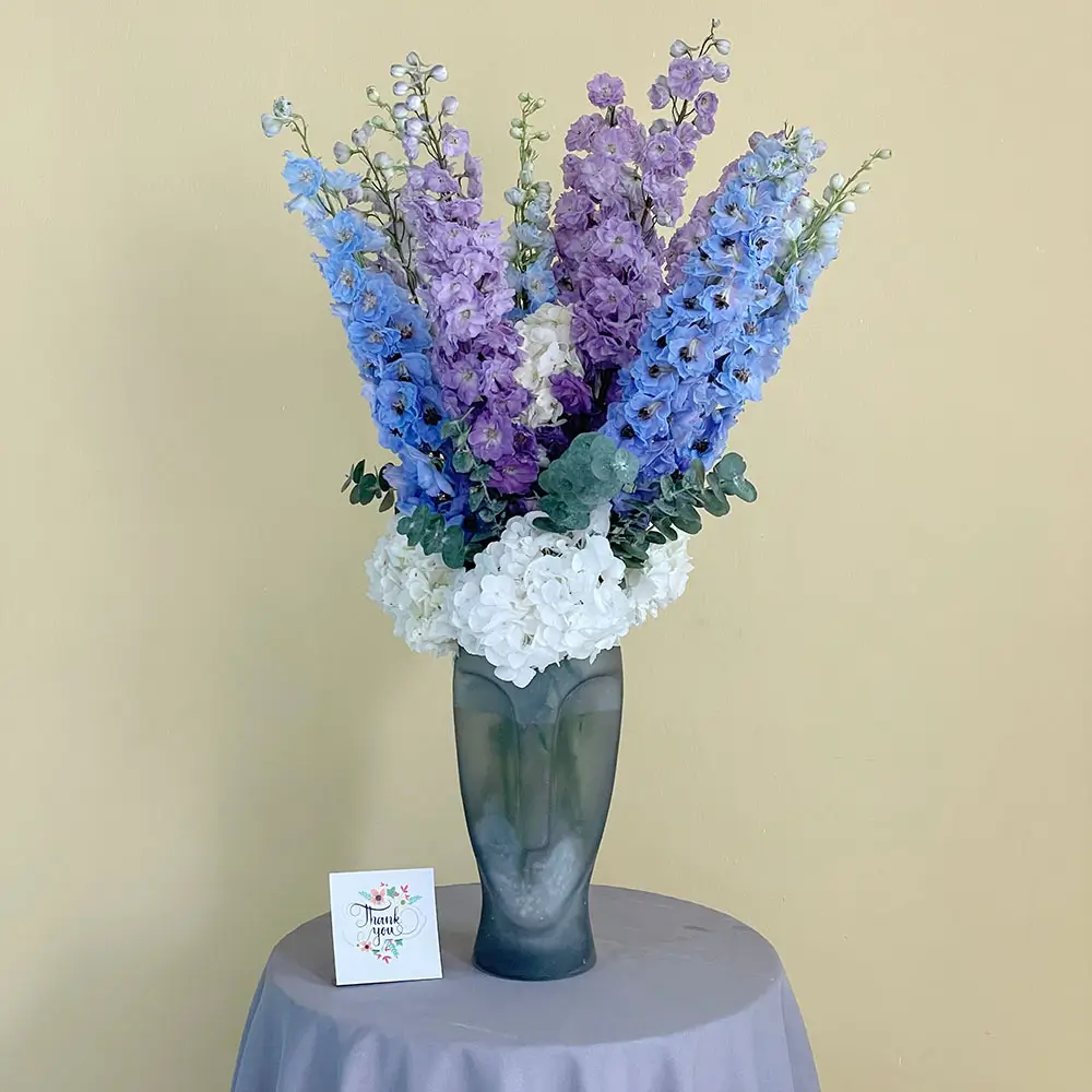 This beautiful arrangement contains delphiniums and hydrangea with green leaves in a vase.