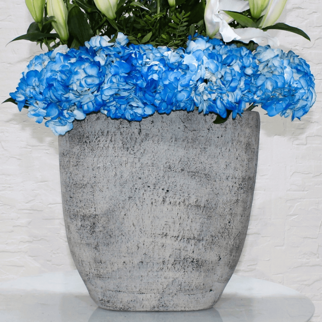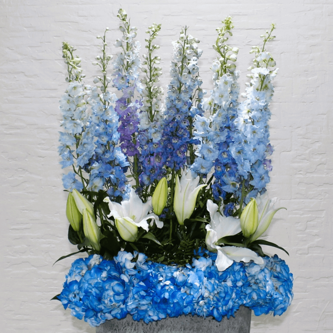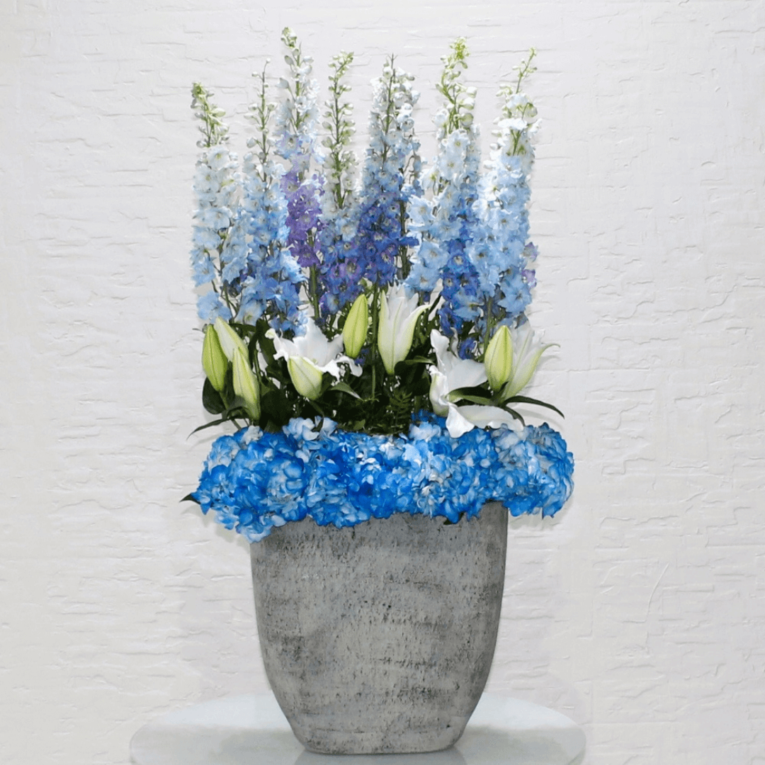 Beautiful delphiniums and lilies and hydrangeas in a ceramic vase.