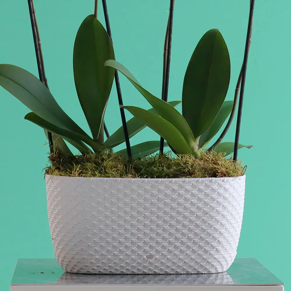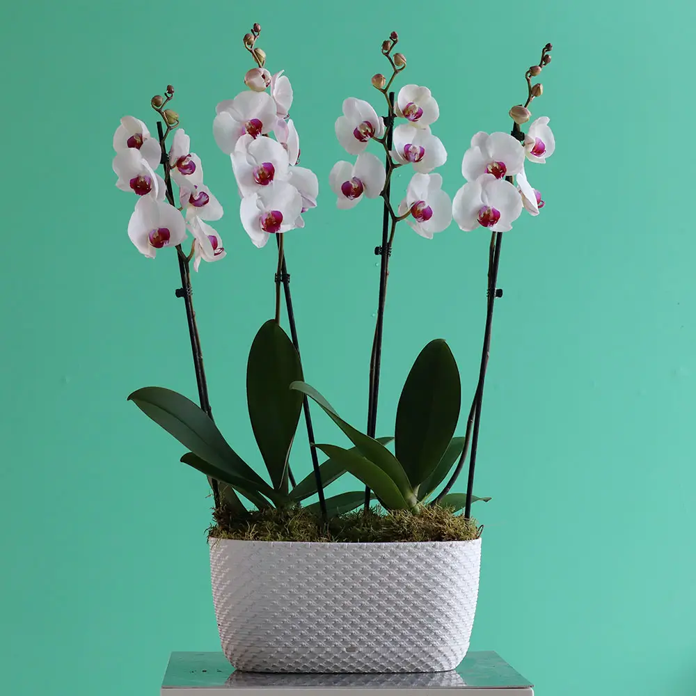 زهور الأوركيد ذات الشفاه الحمراء المذهلة في مزهريات فاخرة