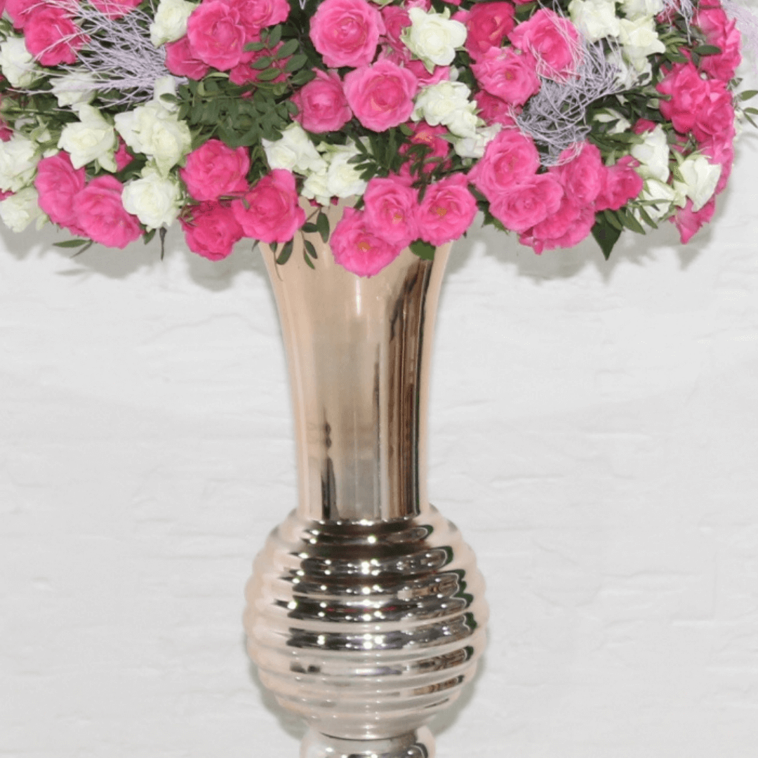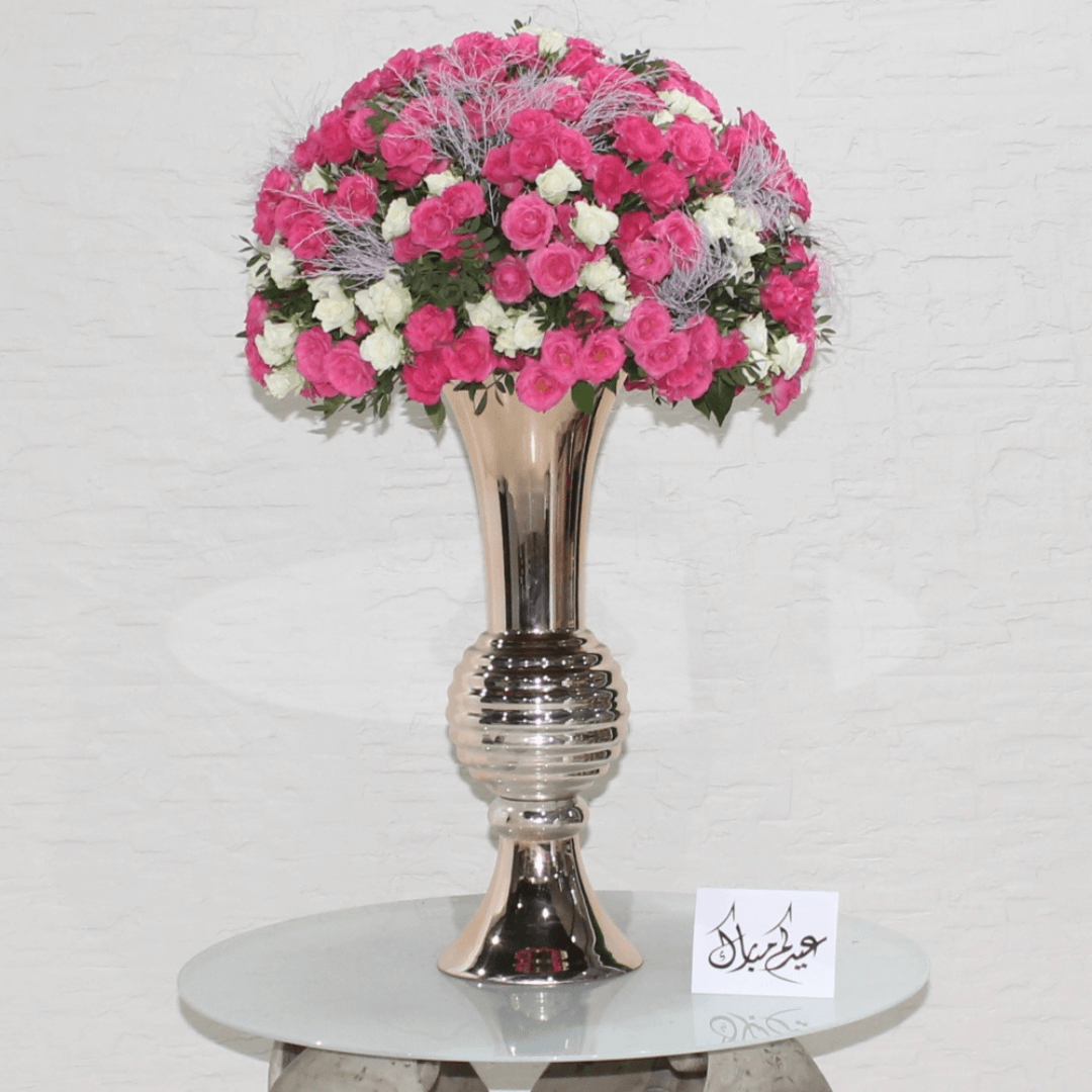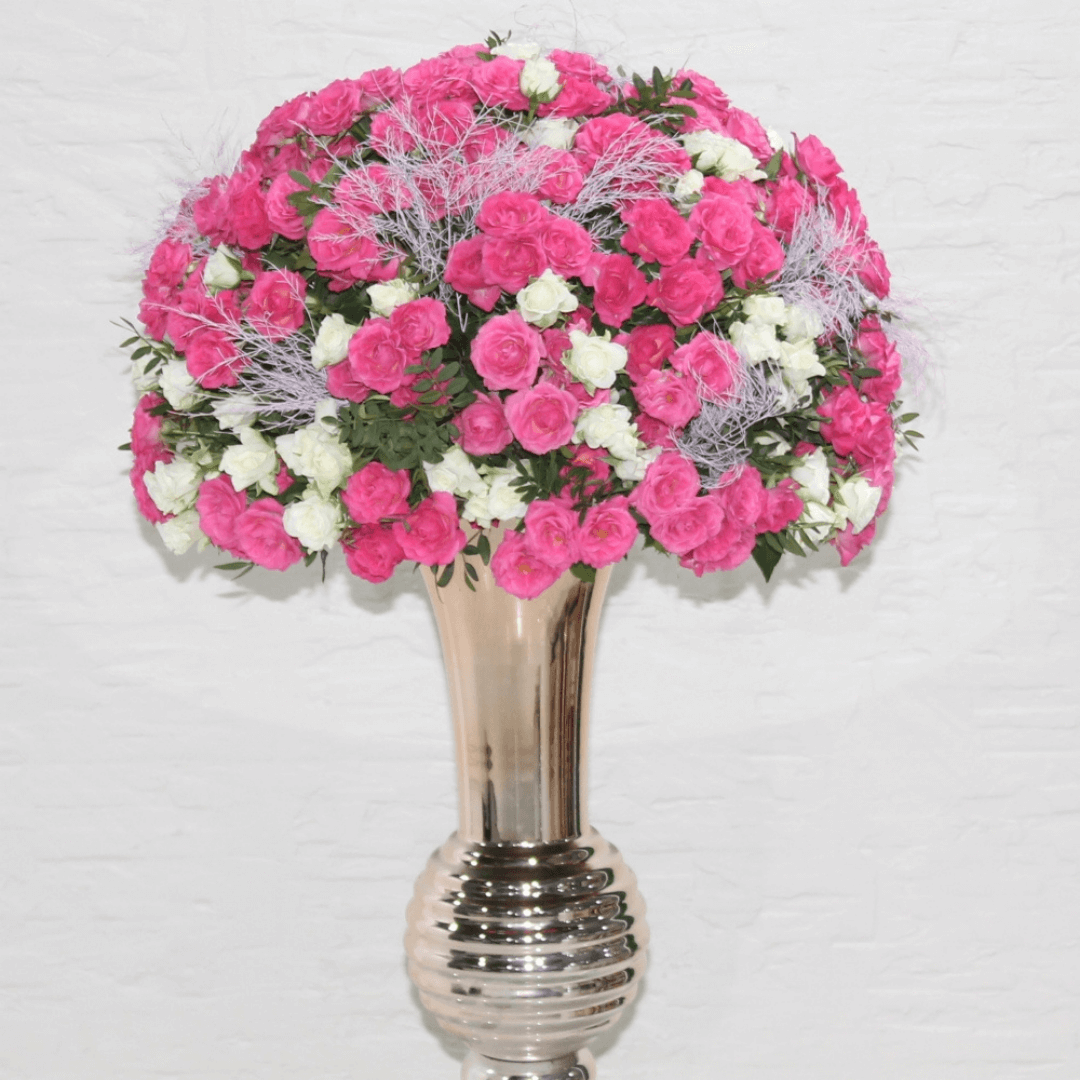 Beautiful pink and white baby roses and green in a elegant tall vases