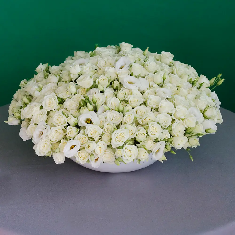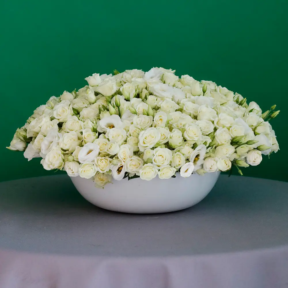 Beautiful Round baby Roses touch Lisianthus in a White Vase