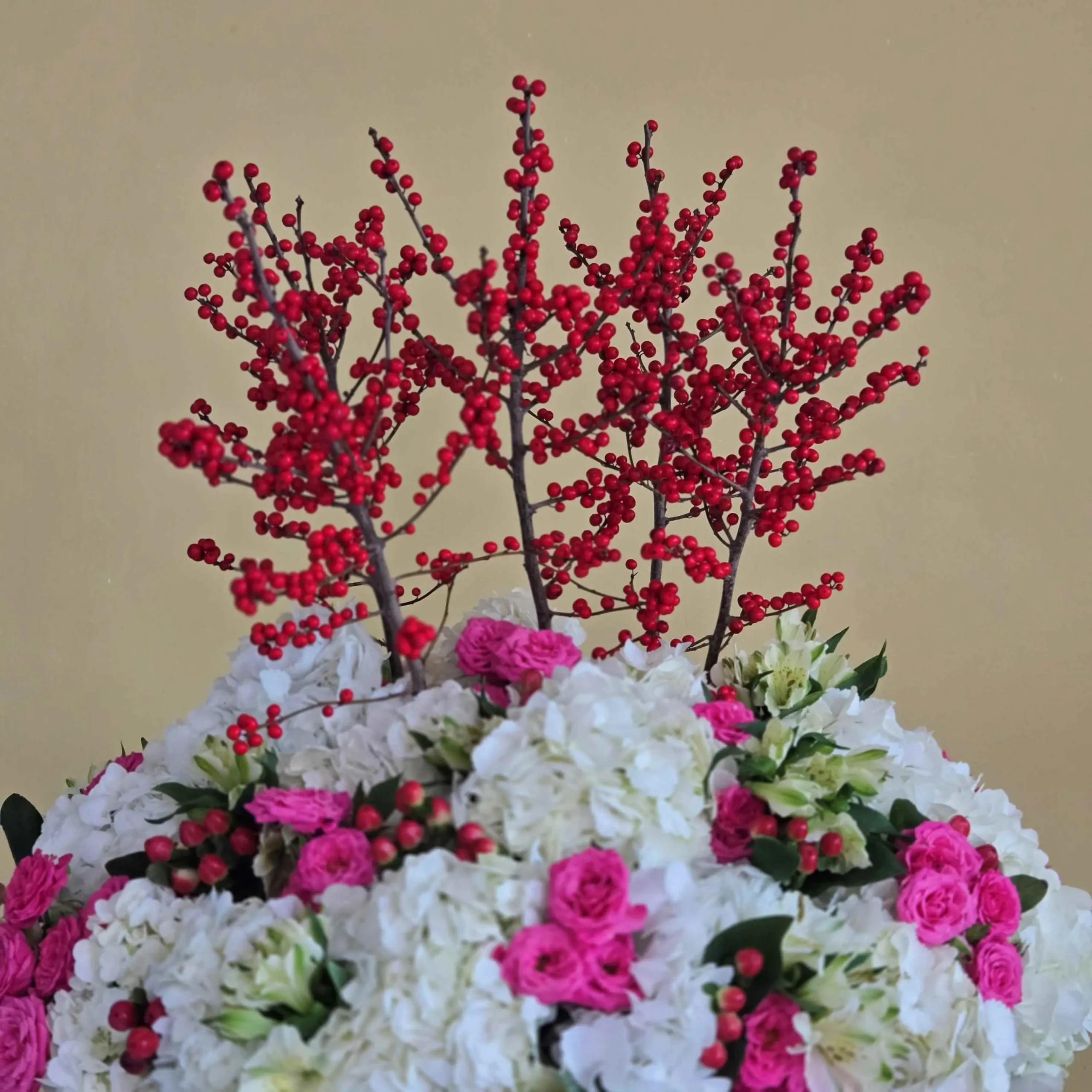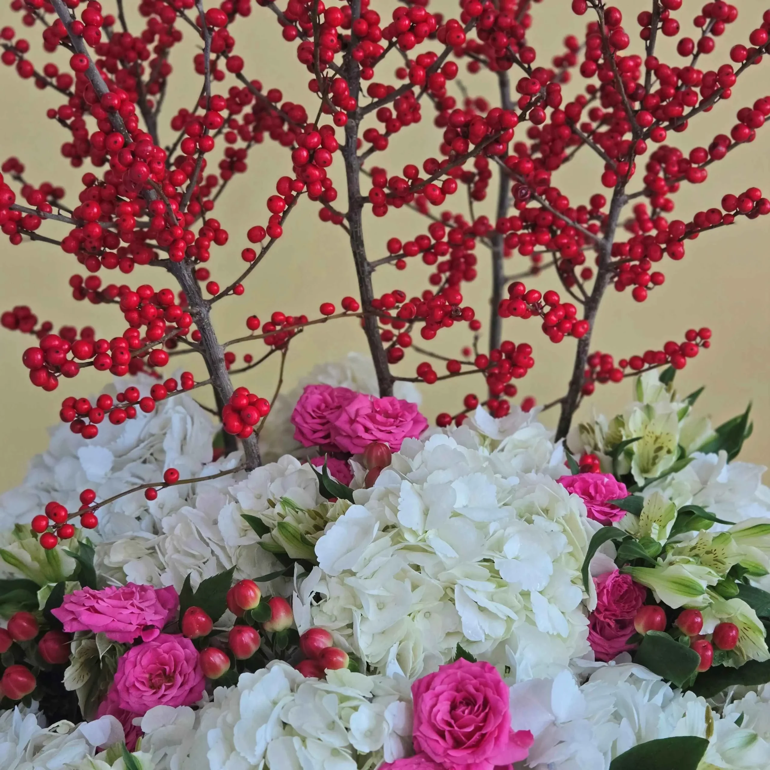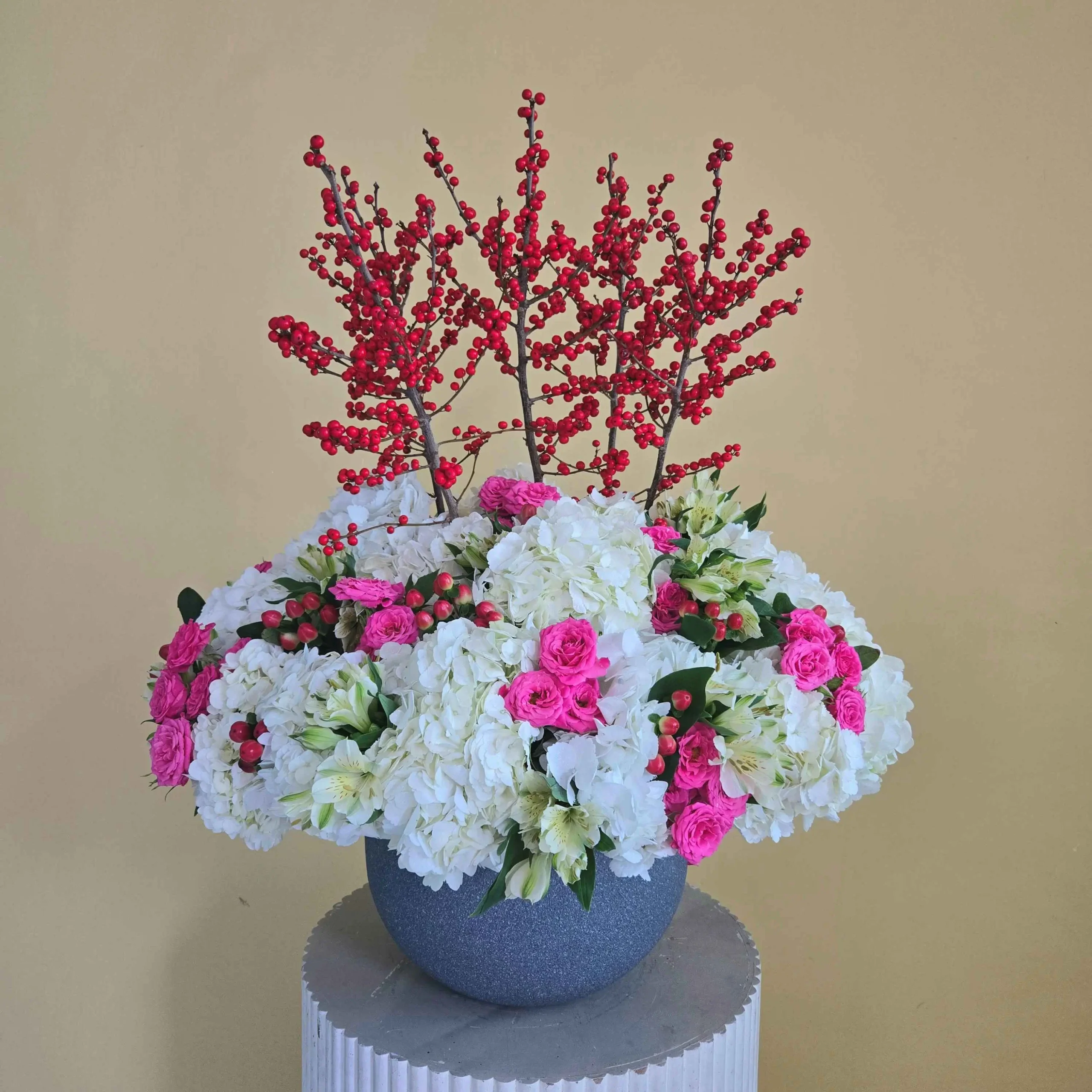 A bouquet of flowers: Ilex, hydrangeas, spray roses, alstroemeria with hypericum in a gray vase.