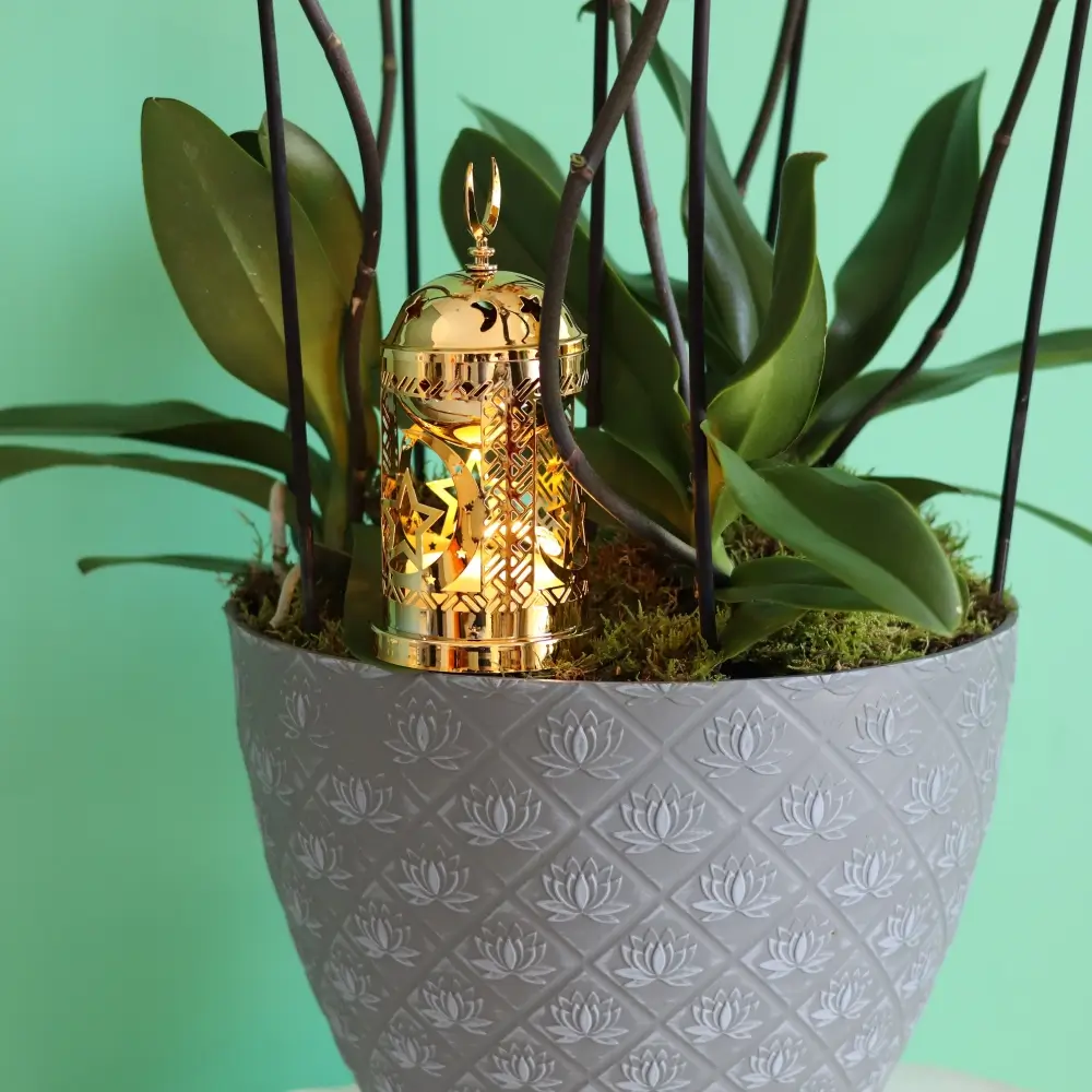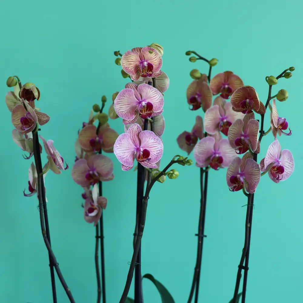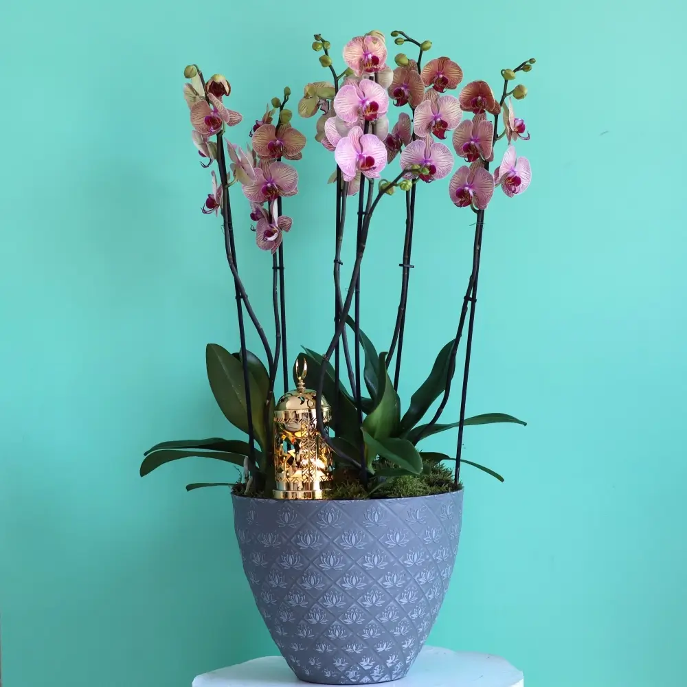 نباتات الأوركيد الجميلة في مزهرية رمادية.