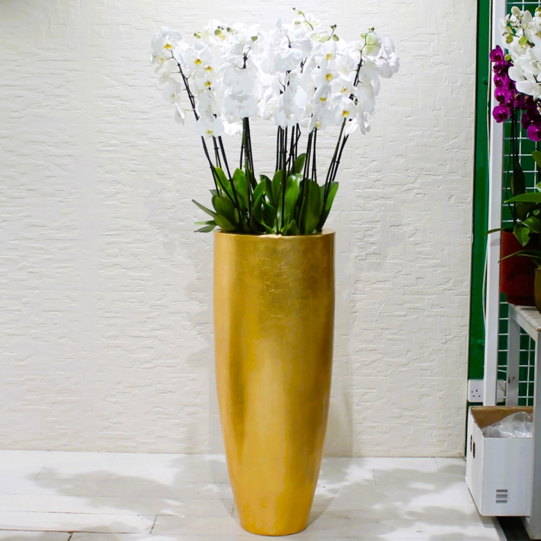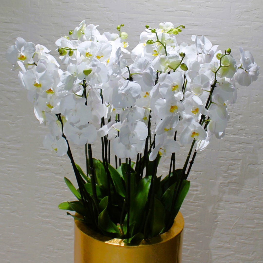 بساتين الفاكهة البيضاء الجميلة مرتبة في مزهرية ذهبية.
