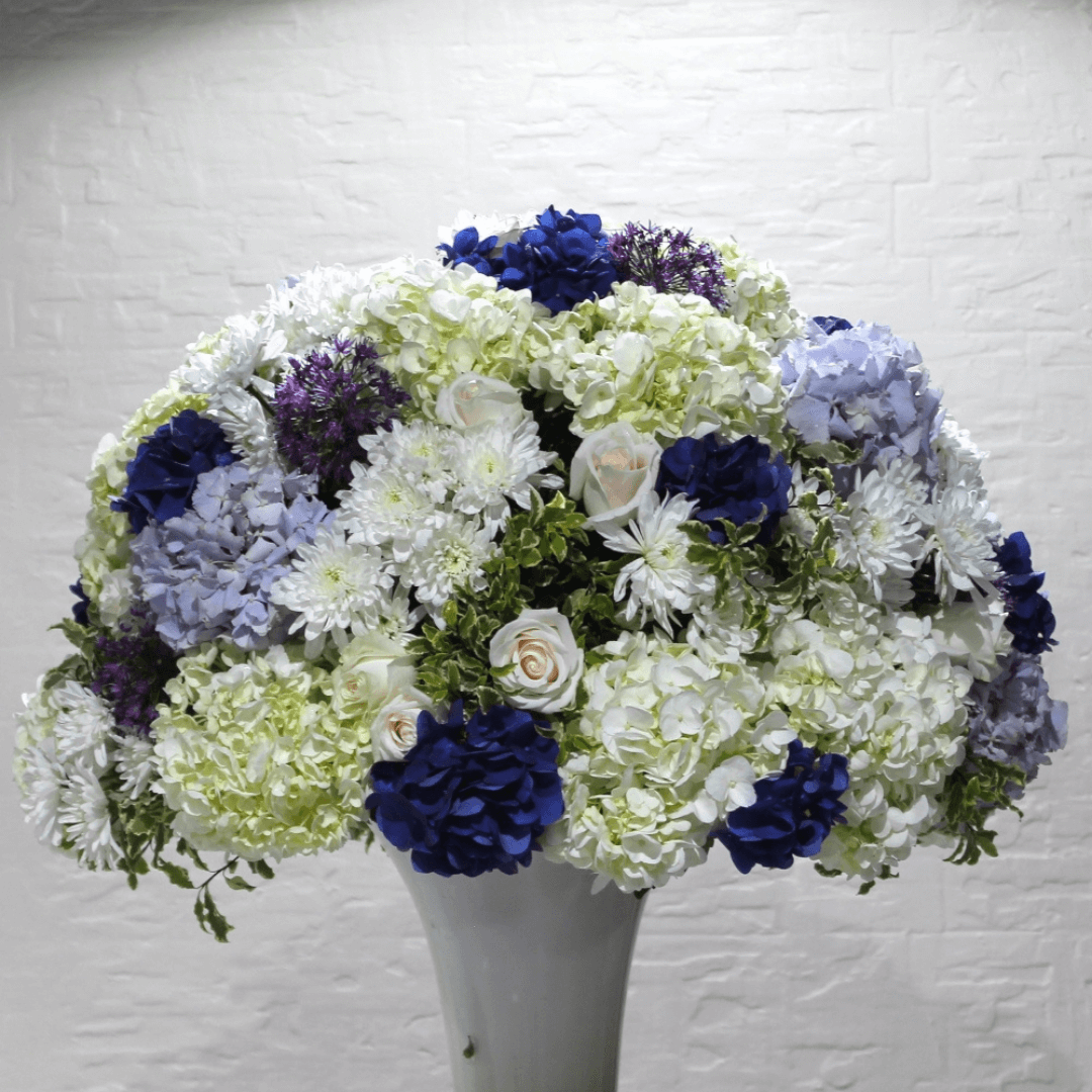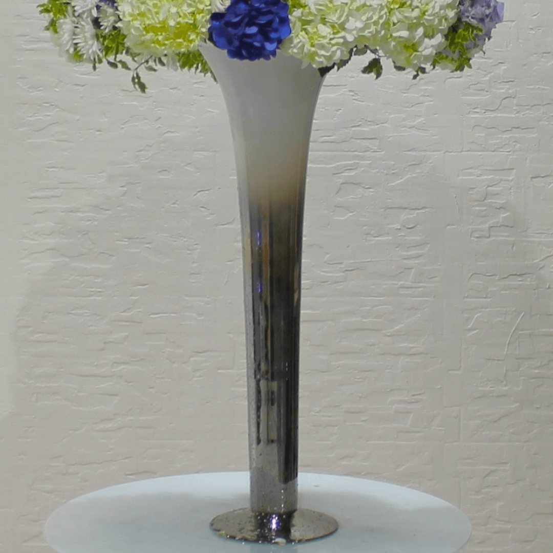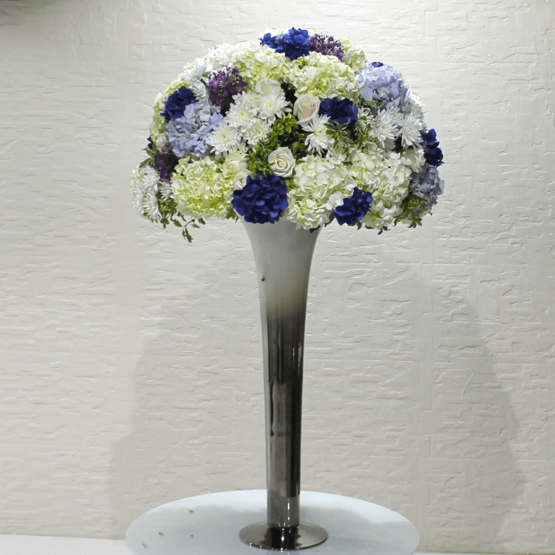 Beautiful flowers filled in a tall glass vase.