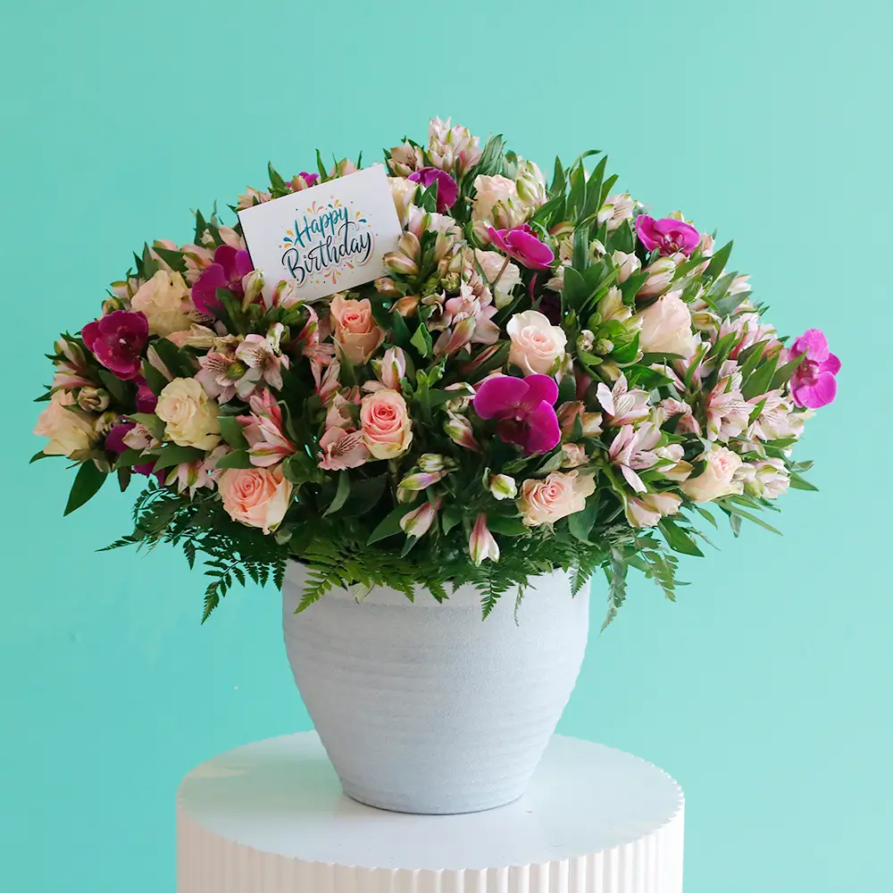 ترتيب جميل لورود الستريميريا بلمسة الأوركيد في مزهريات فاخرة