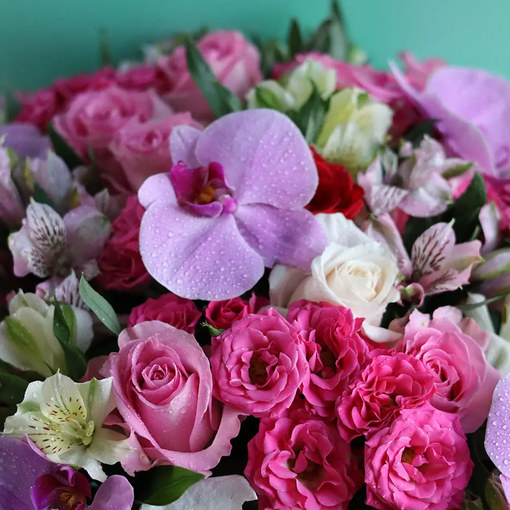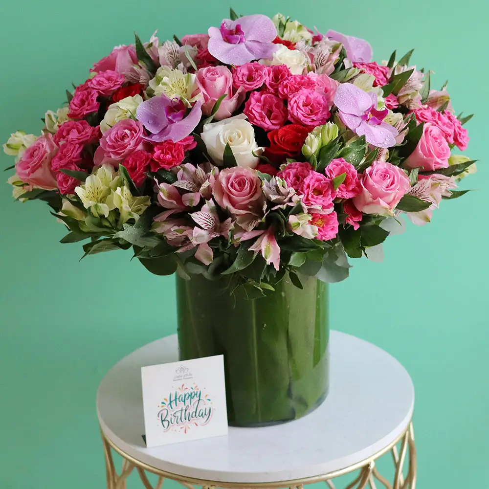 Beautiful arrange Roses alstroemeria touch orchid in a luxury vases