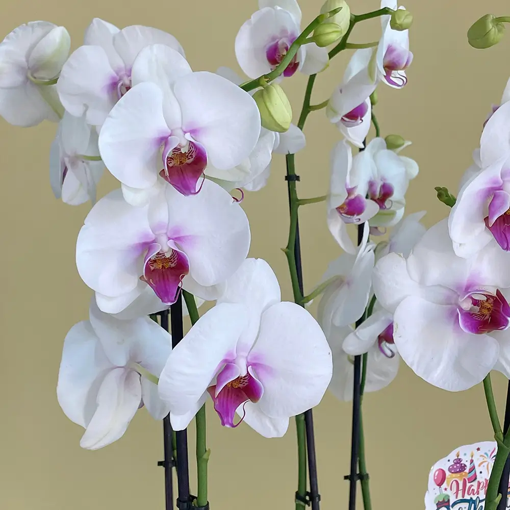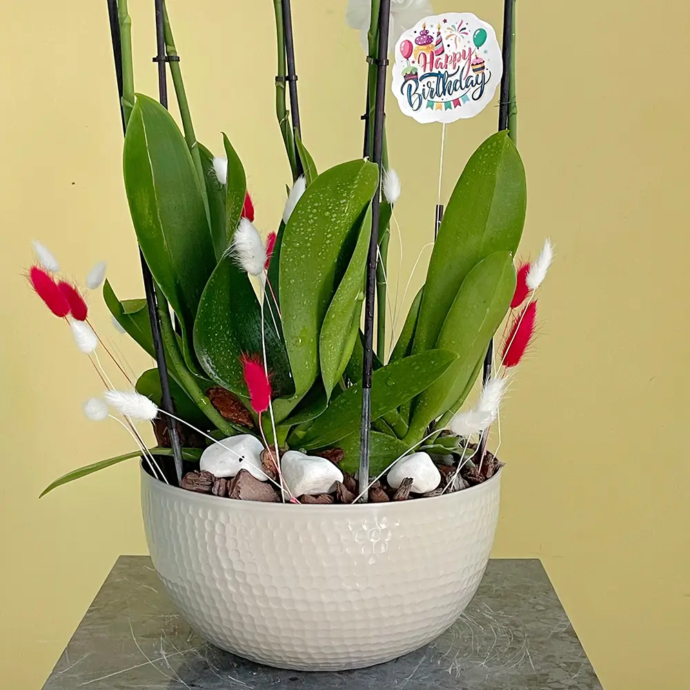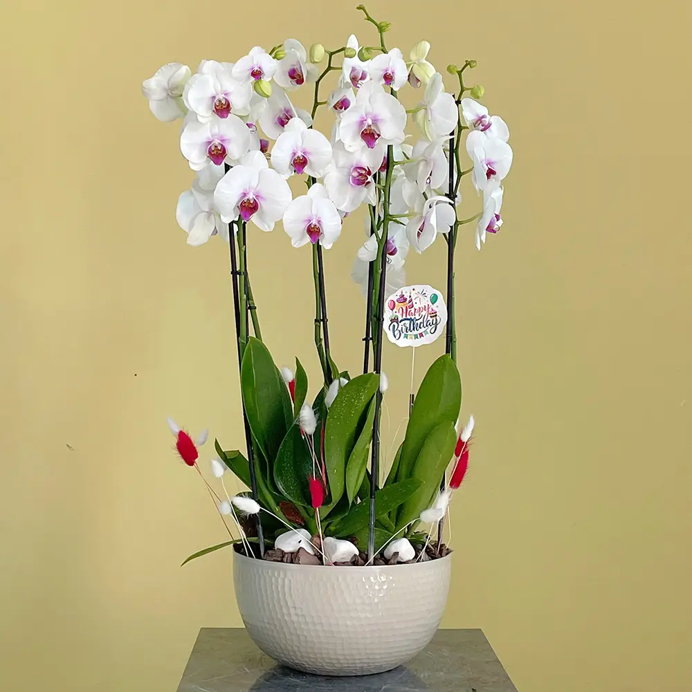 زهور الأوركيد ذات الشفاه الحمراء المذهلة في مزهريات فاخرة