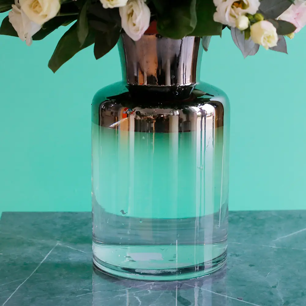 تنسيق جميل لوجه واحد مع الورود البيضاء والليسيانثوس والأوركيدا والخضرة في مزهرية زجاجية سوداء.