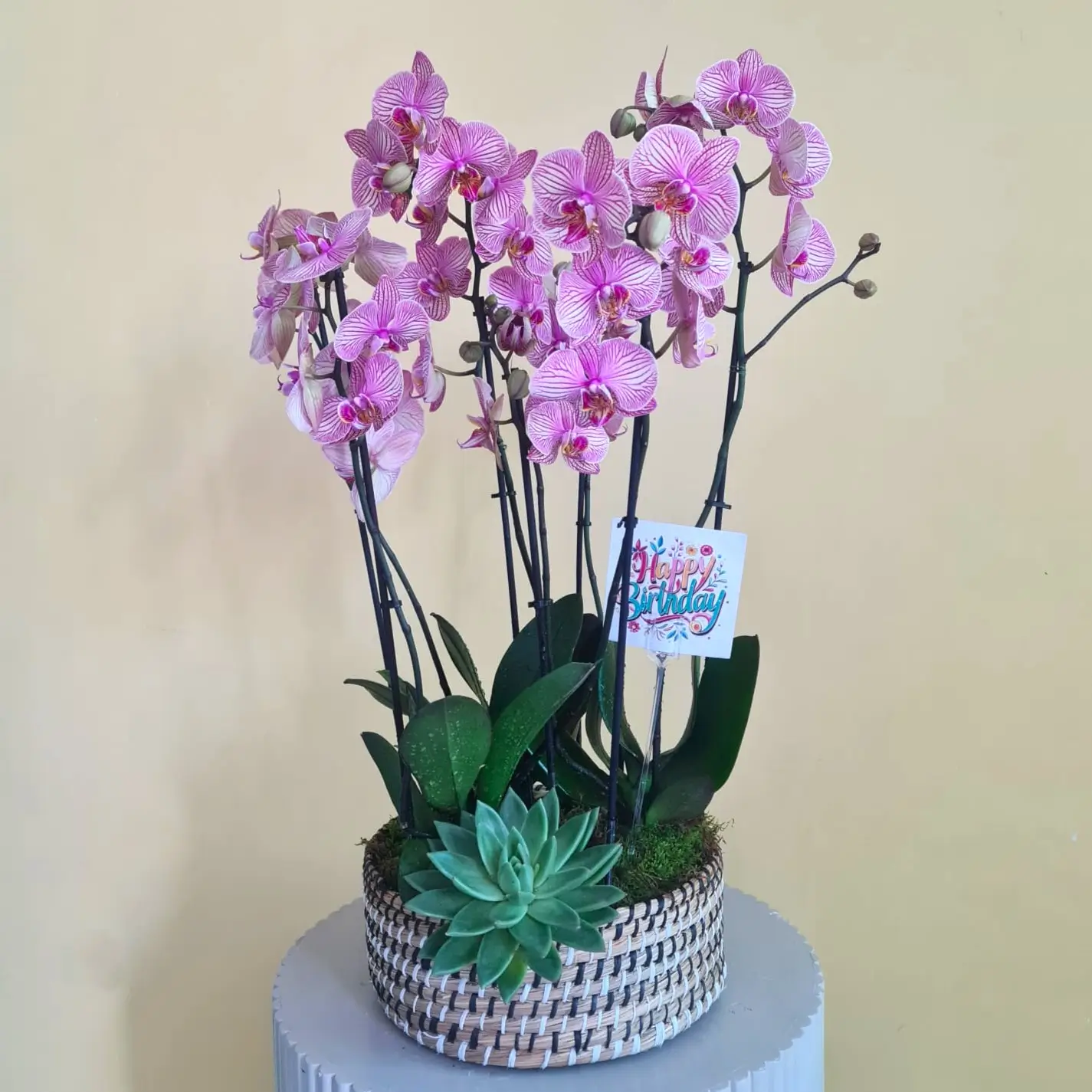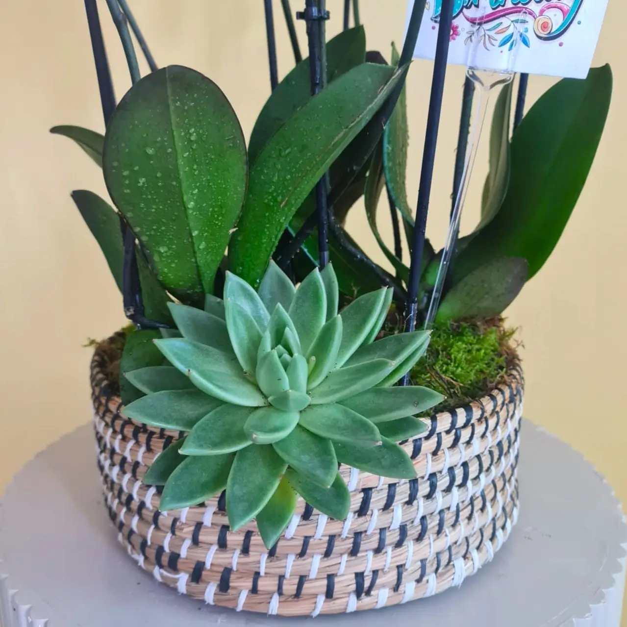A basket that contains phalaenopsis and echveria.