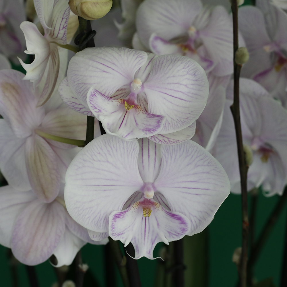 | زهور الأوركيد الخفيفة باللونين الوردي والأبيض في مزهريات فاخرة |