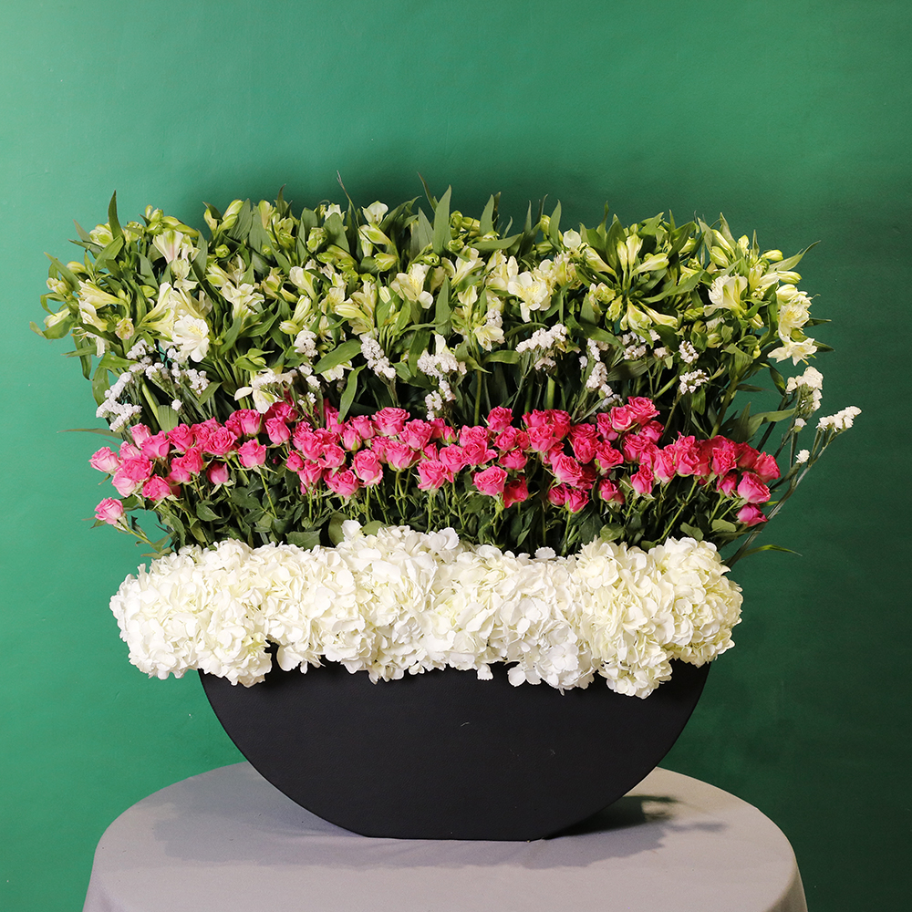| مرتبة بشكل جميل في وردة صغيرة، وهدرانج، وألستروميريا مع بيضاوي أسود فاخر. |