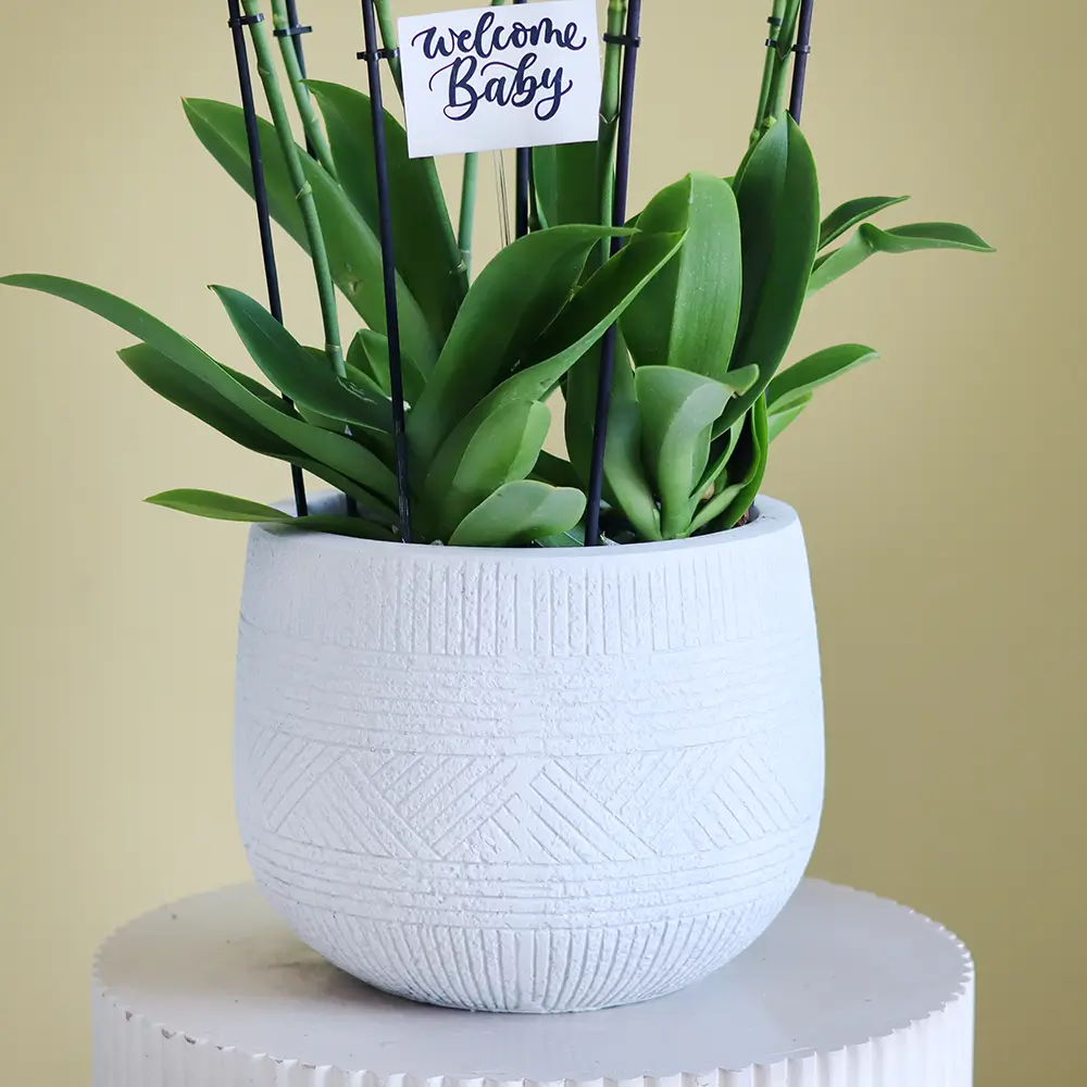 زهور الأوركيد ذات الشفاه الحمراء المذهلة مرتبة في مزهرية خزفية.