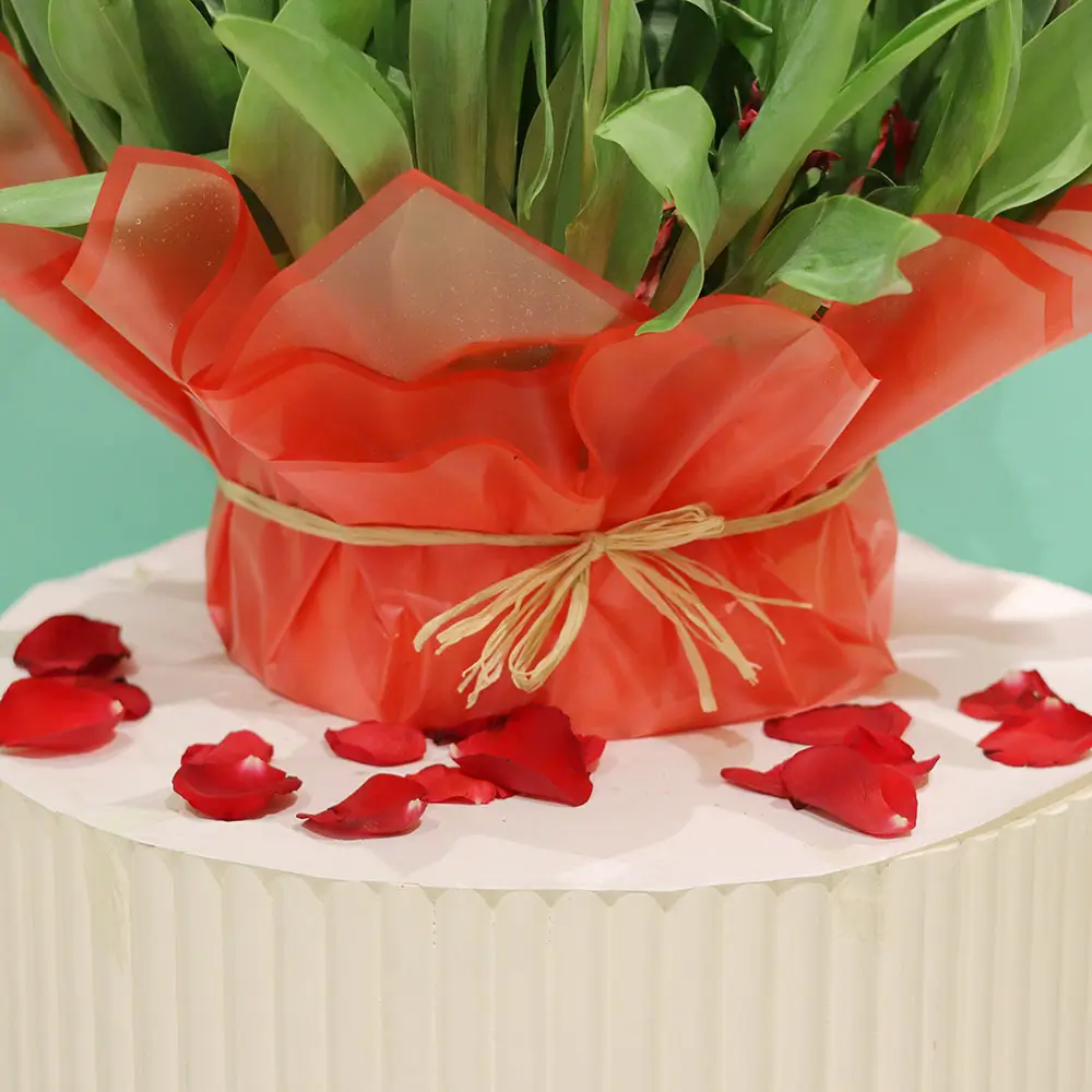 تنسيق زهور التوليب الحمراء بشكل جميل مع ورق التغليف الأحمر في المزهريات