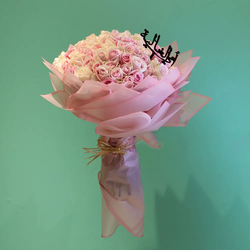 Beautiful Round Roses Bouquet in a pink wrapping paper
