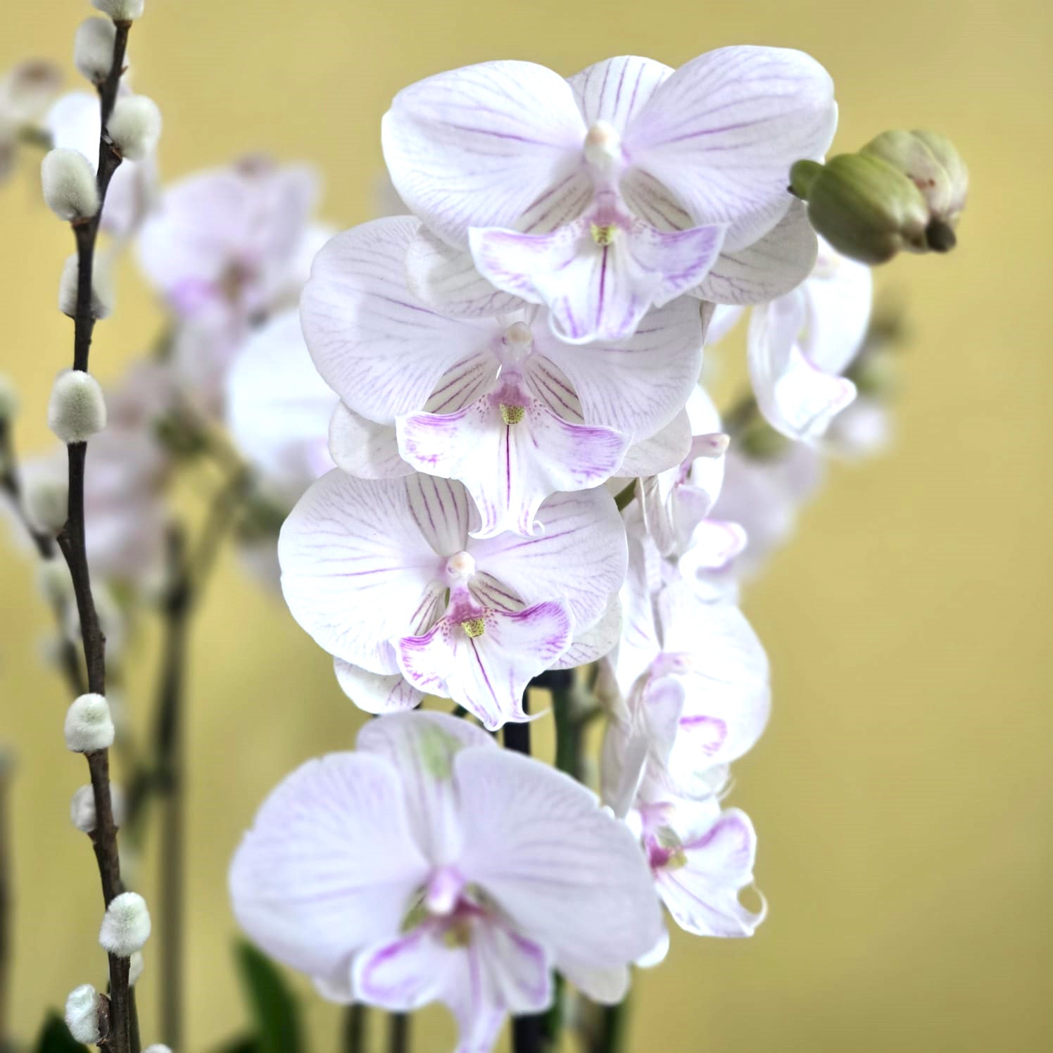 Phalaenopsis Manta Ambon with cotton sticks and flat moss arranged in gold glass vase.