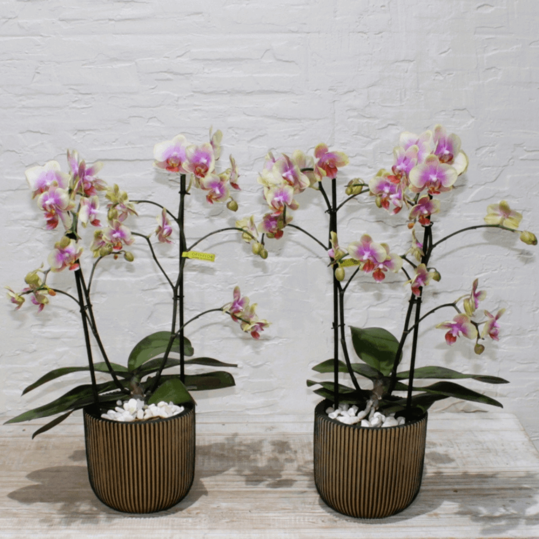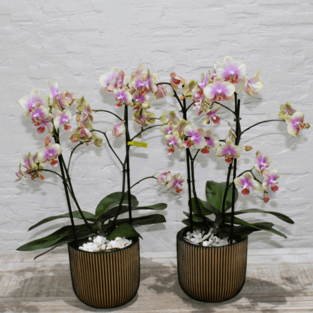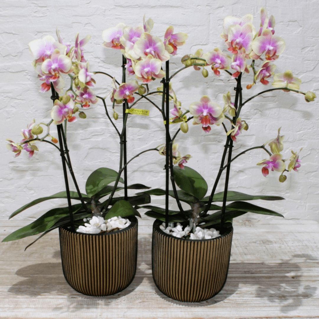 زهرة أوركيد صفراء وردية صغيرة مذهلة في مزهرية ذهبية سوداء فاخرة