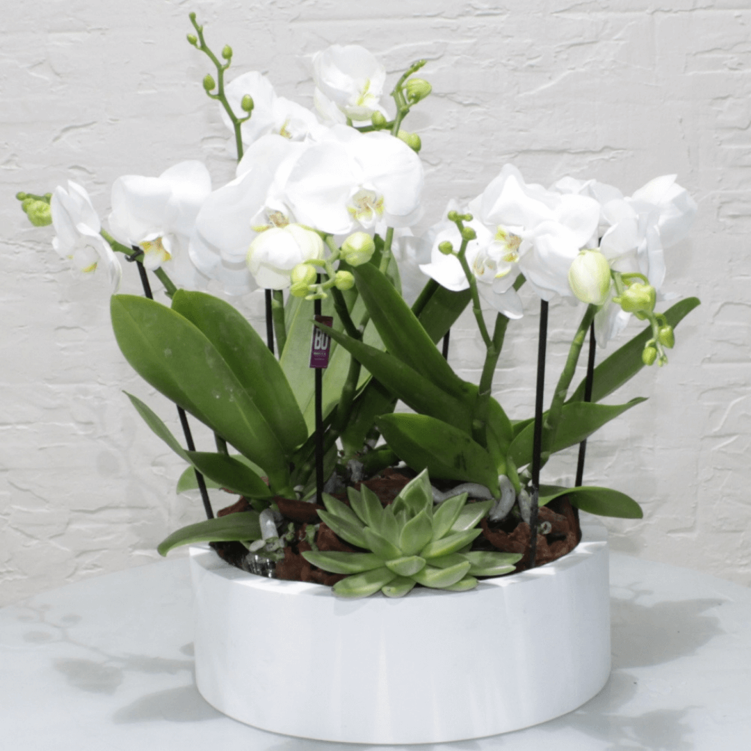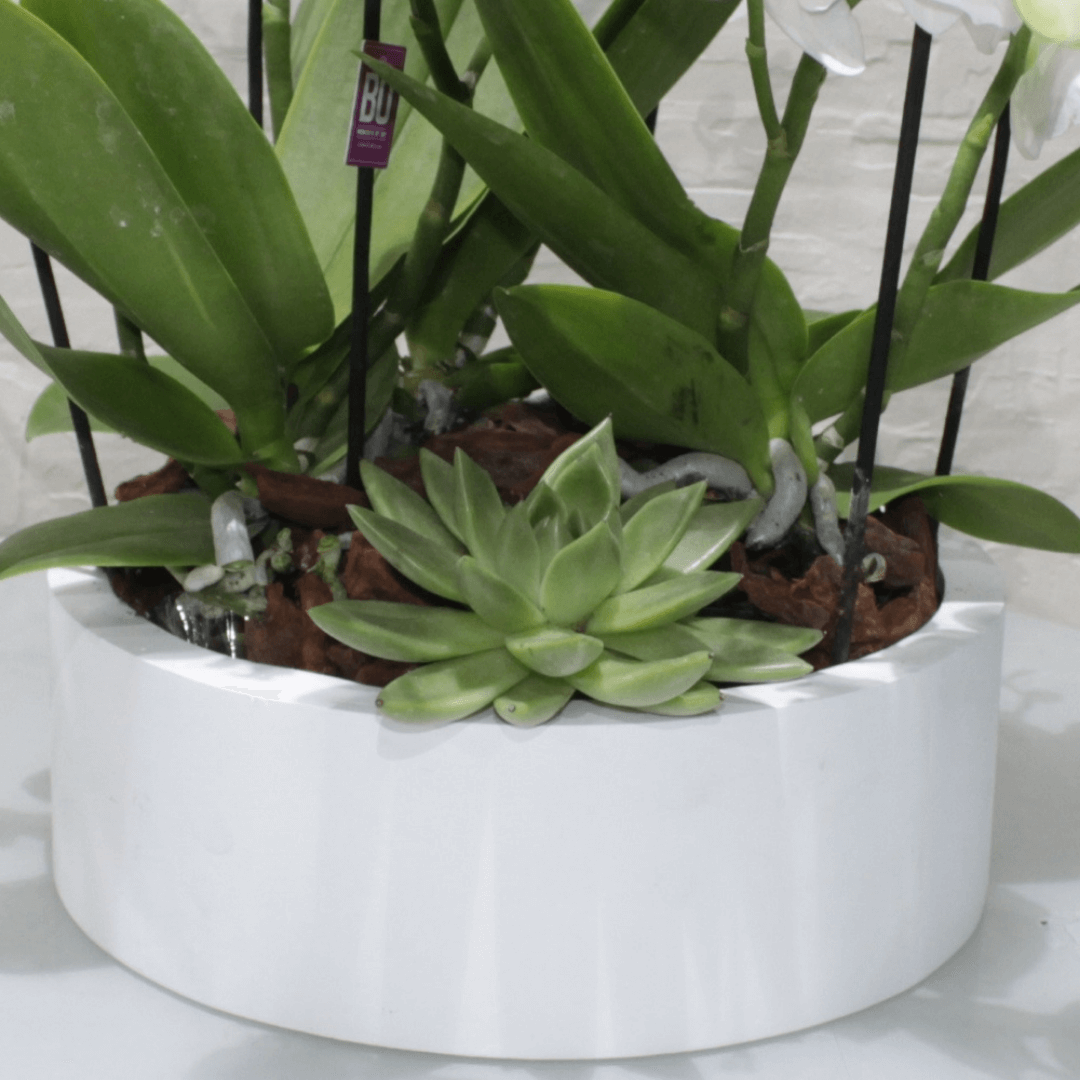amazing mini white orchid echeveria in a luxury round vase