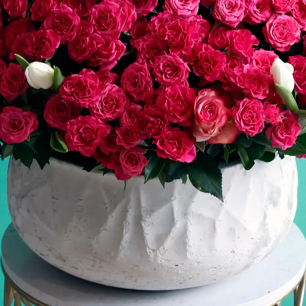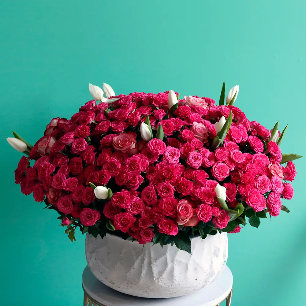 Gorgeous Baby Roses Touch Tulip Bouquet in a white Round Vase