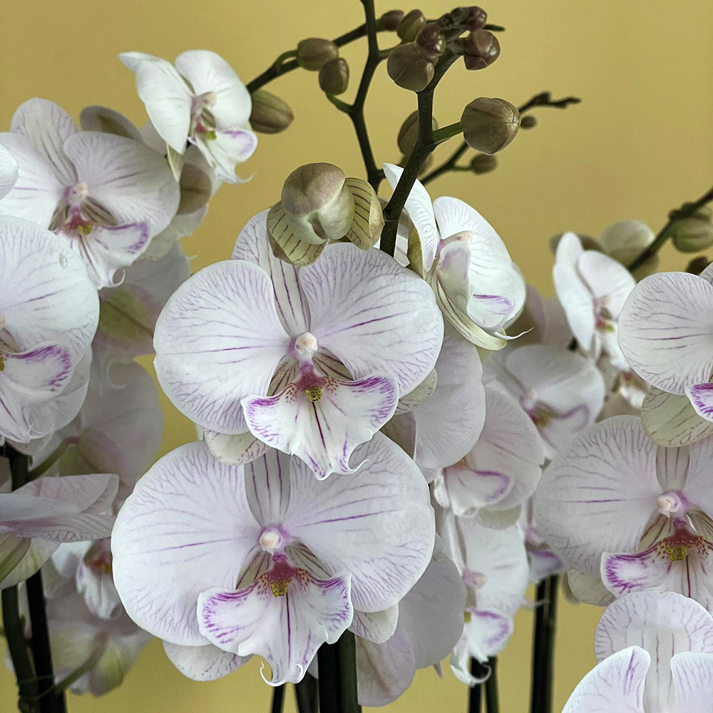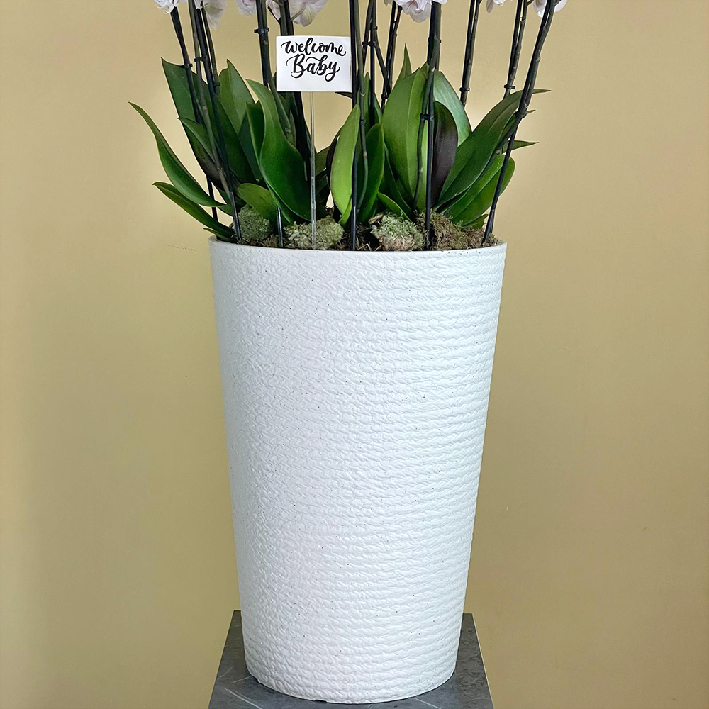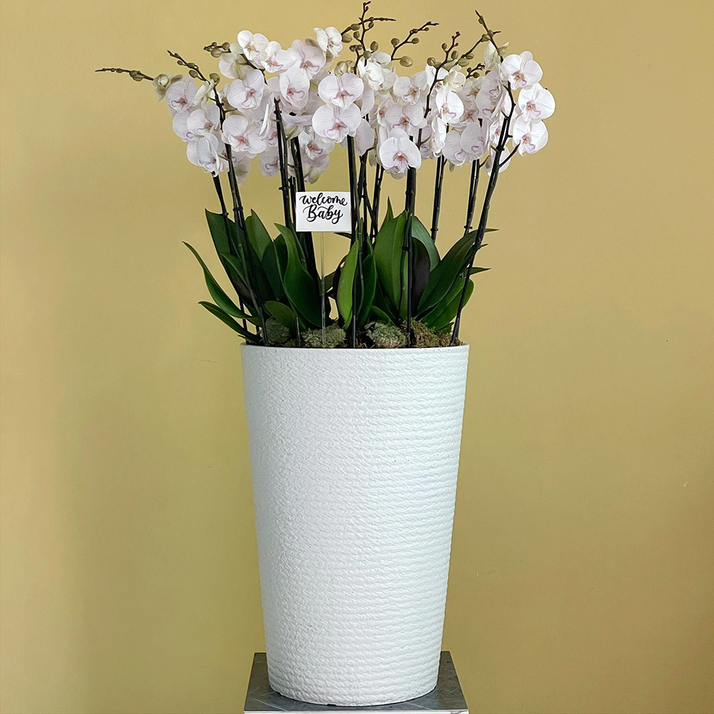 زهرة أوركيد بيضاء مذهلة في مزهرية فاخرة