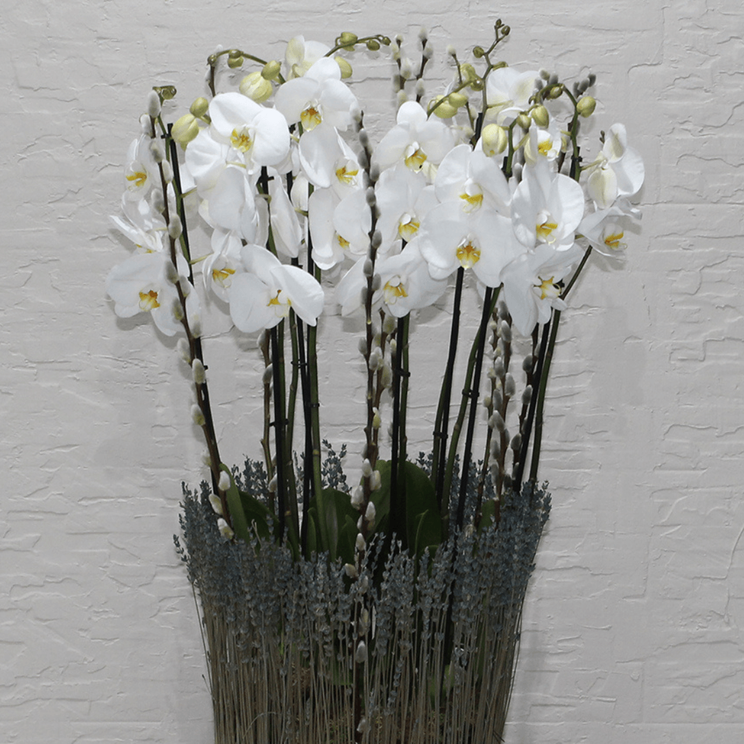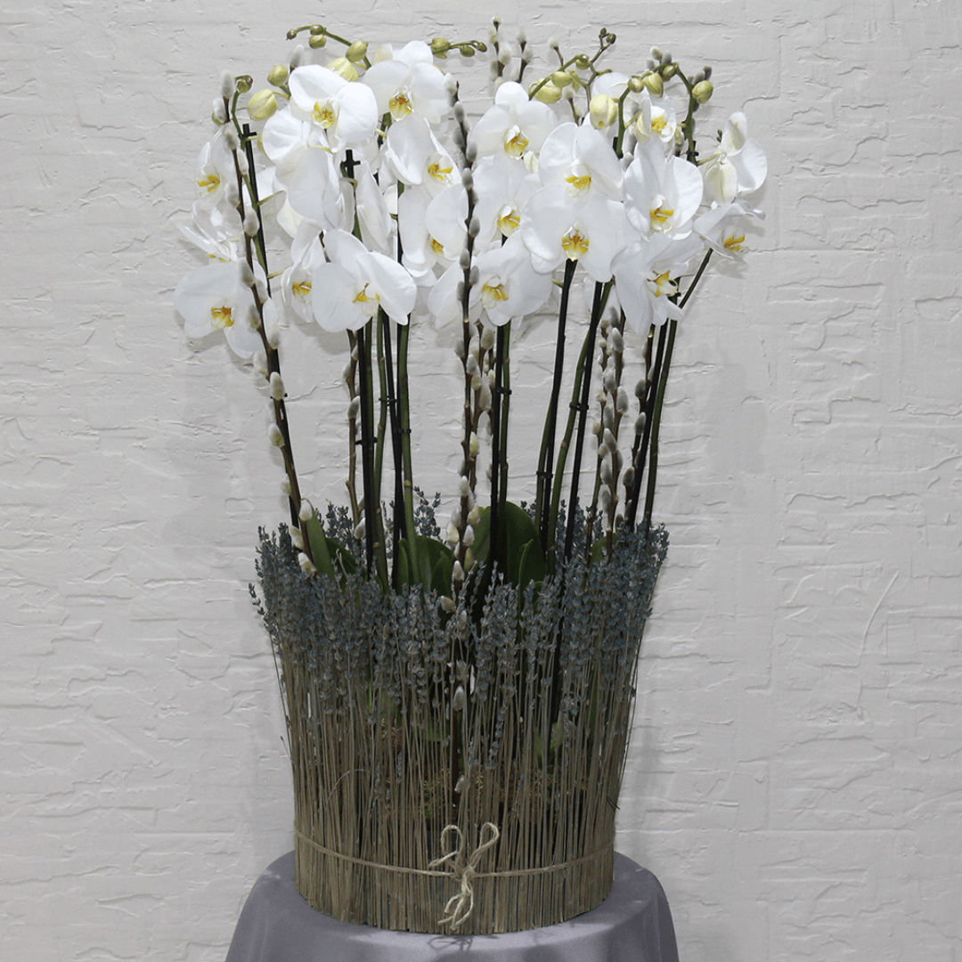 نباتات الأوركيد البيضاء الرائعة مع اللافندر في مزهرية مستديرة.