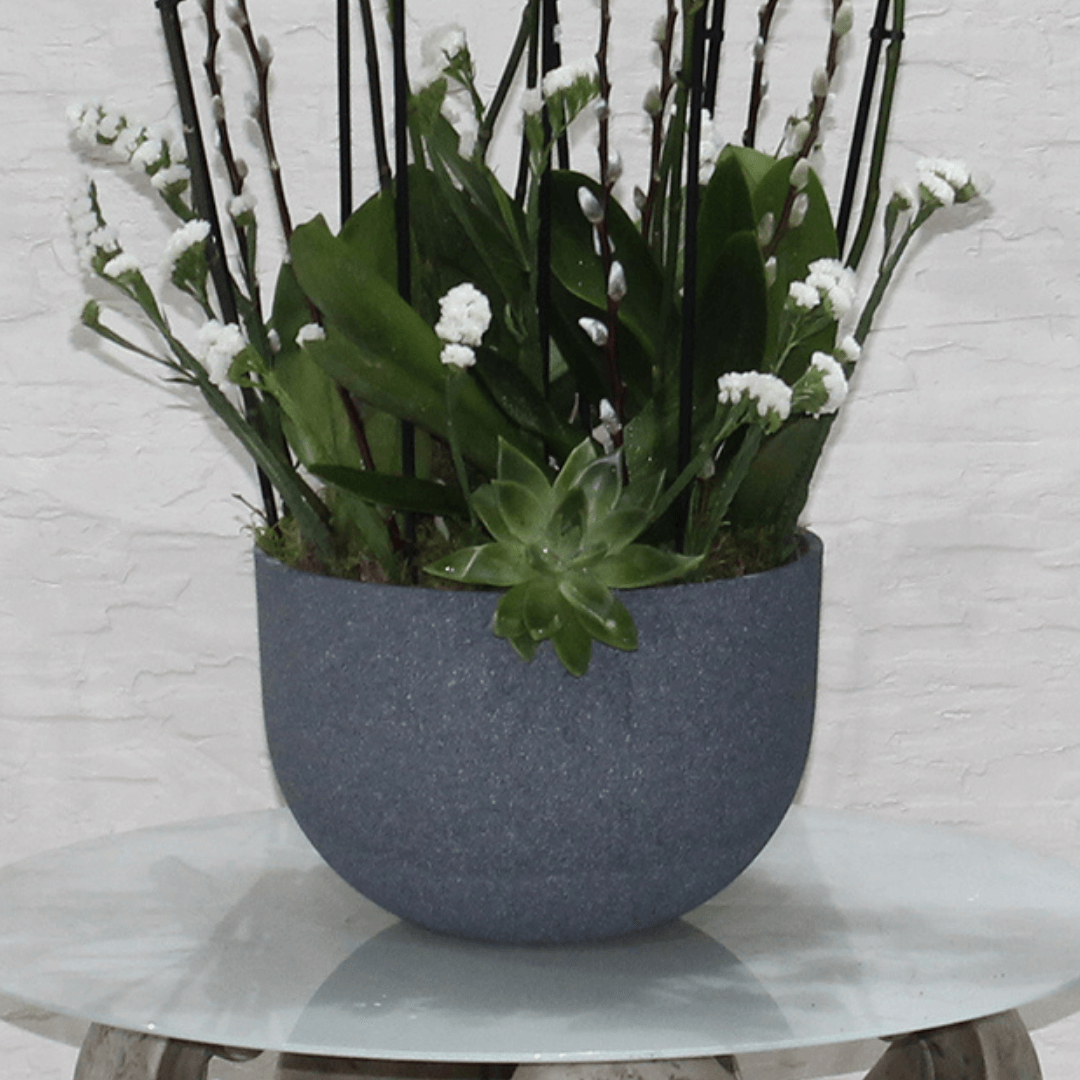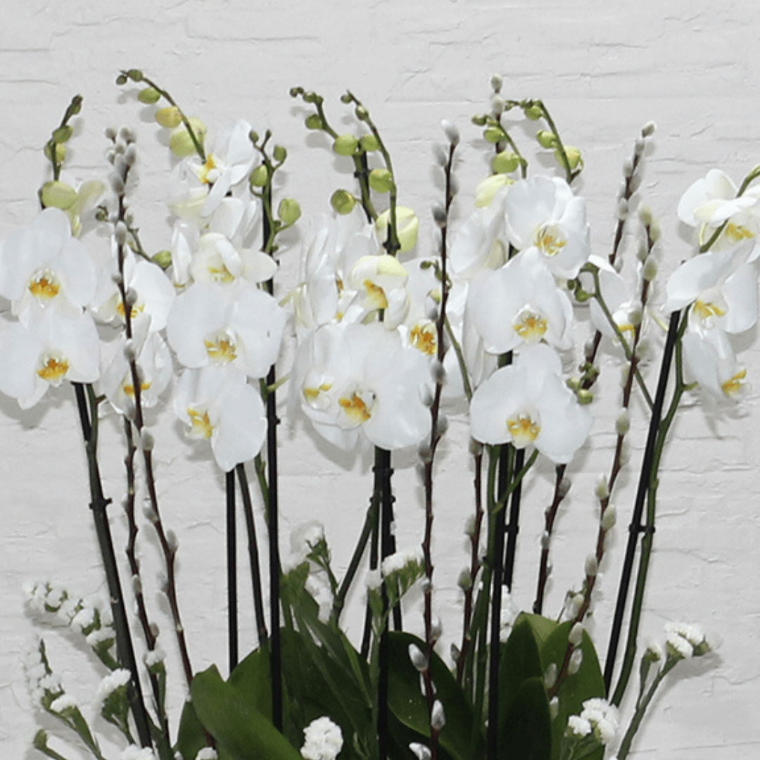 زهور الأوركيد البيضاء المذهلة في مزهرية مستديرة