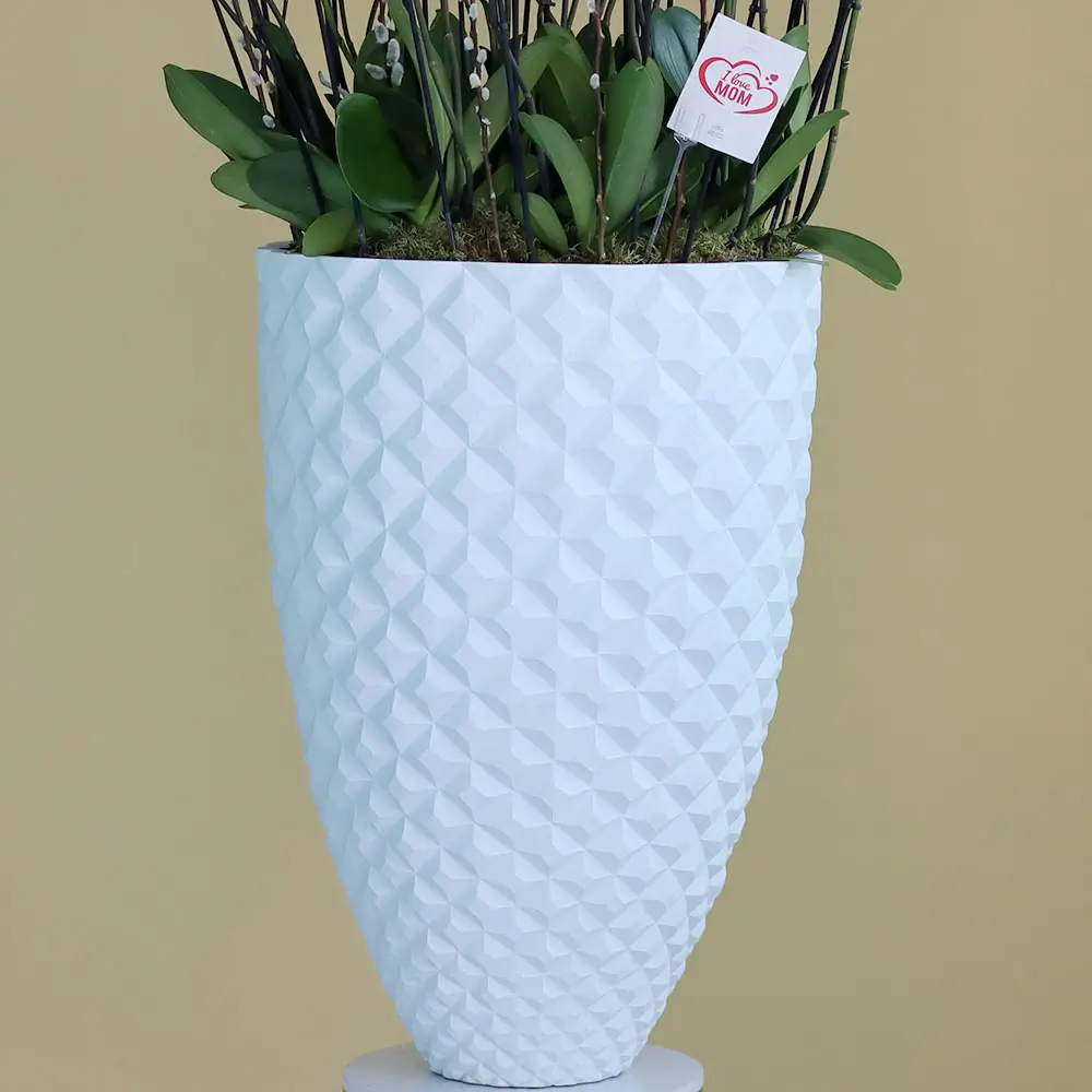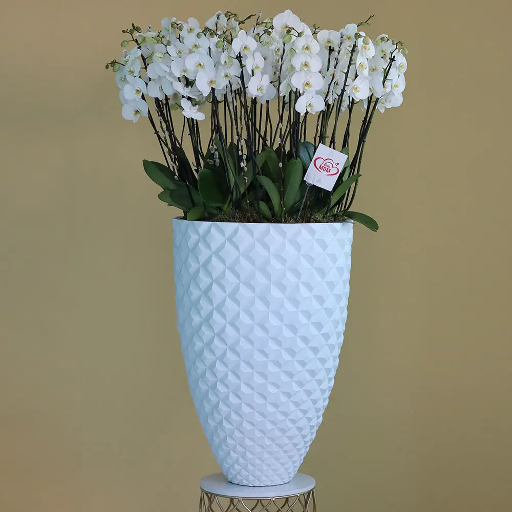 زهور الأوركيد ذات الشفاه الحمراء المذهلة في مزهريات فاخرة